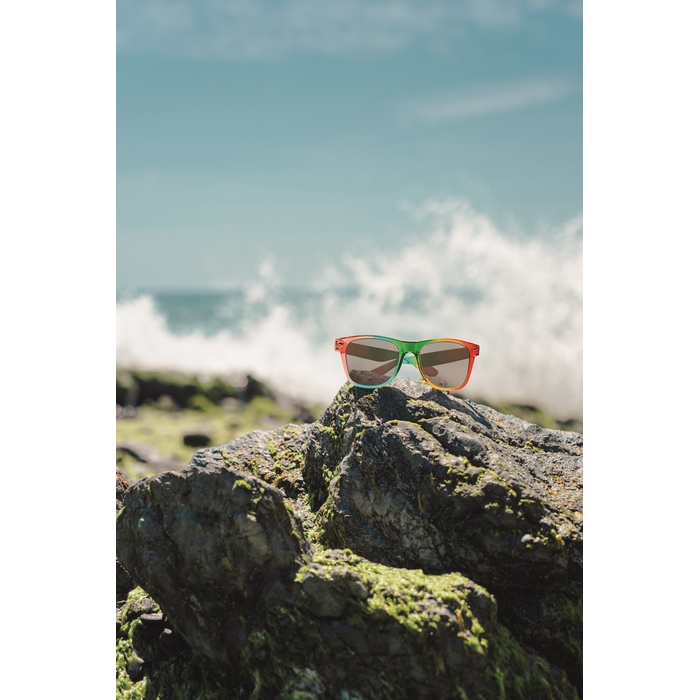 Duhové vícebarevné sluneční brýle s PC obroučkou a UV400 ochranou. Rozměry: 14.2 x 4.6 x 14 cm