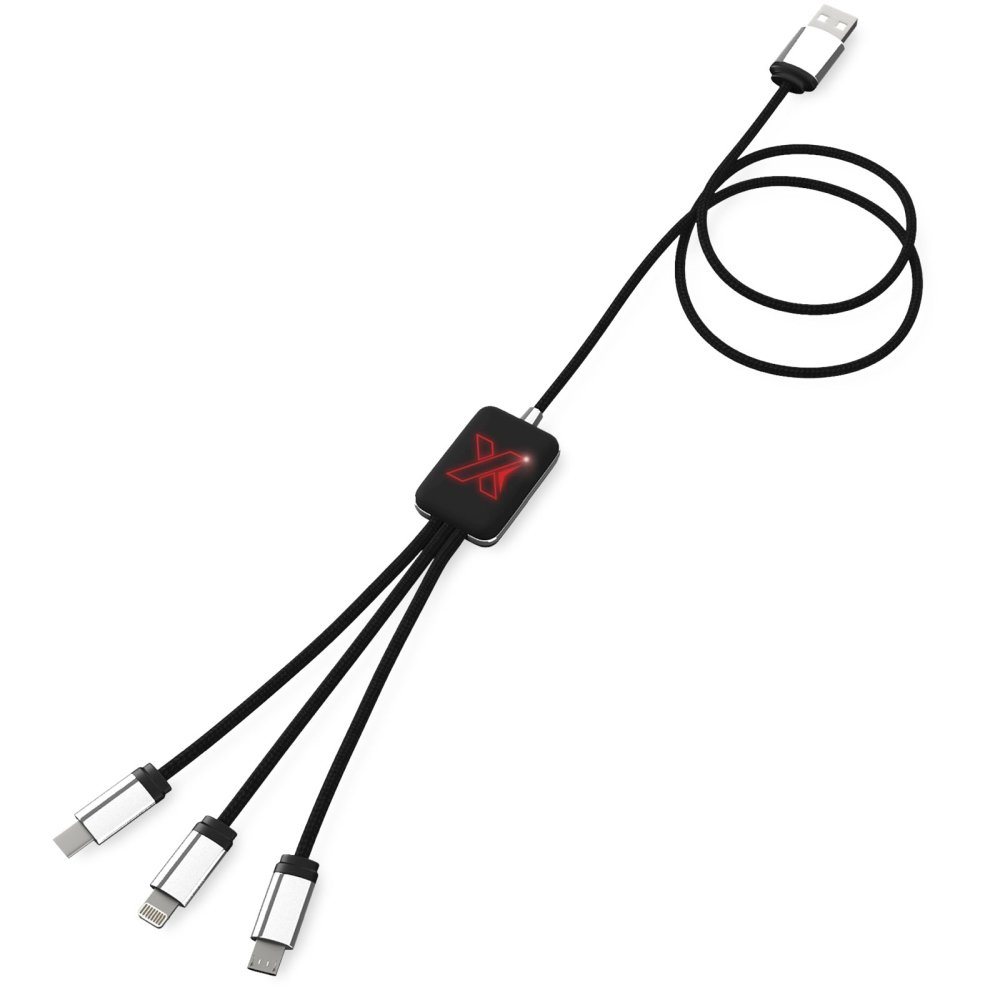 Dobíjecí kabel se světelným logem, gumovým povrchem, kovovými doplňky a třemi výstupními konektory (USB-C, Android, iPhone). Lze nabíjet až tři zařízení současně. Délka kabelů (včetně zástrček): 10 cm. Celková délka kabelu: 1 metr. Recyklovaný PET kabel a obal jsou vyrobeny z recyklovaného papíru a recyklovaného plastu. Rozměry: 100 x 1,2 x 3 cm