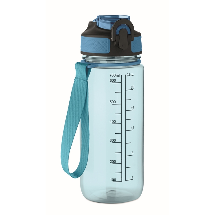 Motivační sportovní láhev na vodu z RPET s integrovaným brčkem, měkkým silikonovým náustkem, víčkem otevíratelným jednou rukou a bezpečnostním zámkem. Poutko z RPET saténu. Objem 700 ml. Neteče. Rozměry: O7.7 x 21.5 cm