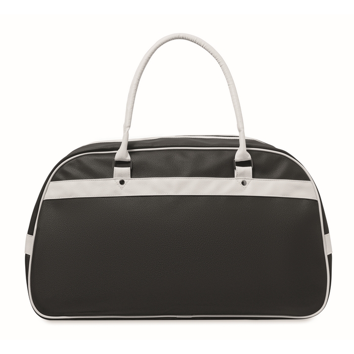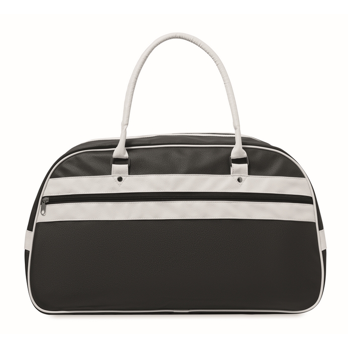 Sportovní taška z PU. Vnitřní podšívka, hlavní přihrádka a kapsa na zip, pevná ucha s cvočky a vsadka na dně. Objem cca 21,5 litru. Rozměry: 48 x 25 x 28 cm