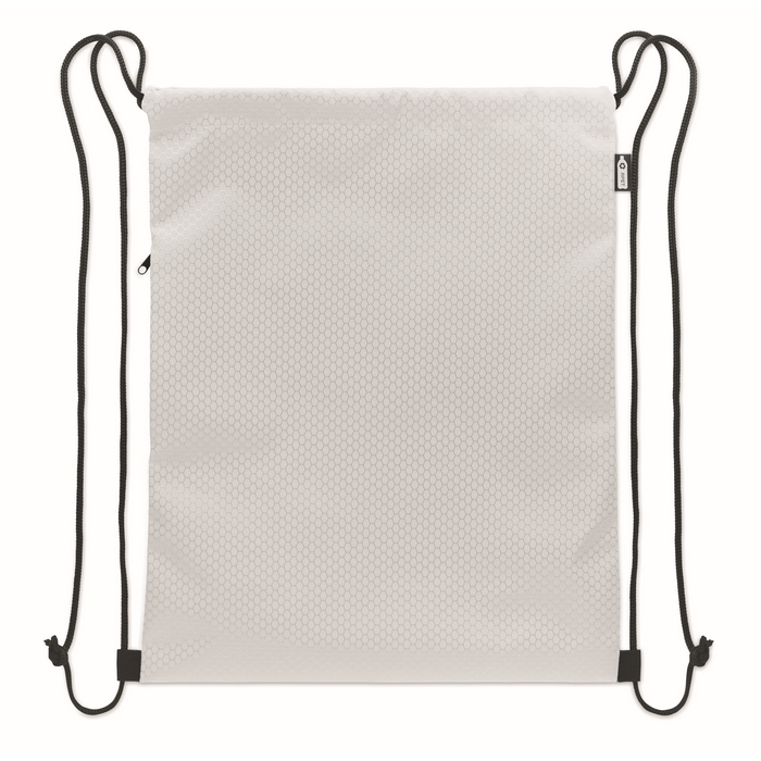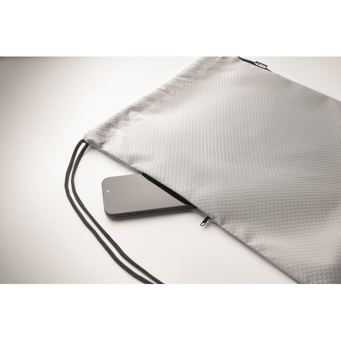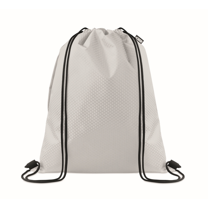Stahovací batoh z polyesteru RPET 420D s vertikální boční kapsou na zip a podšívkou z materiálu RPET 210D. Pevné šňůrky, objem 4,5 l, maximální nosnost 5 kg. Rozměry: 34 x 42 cm