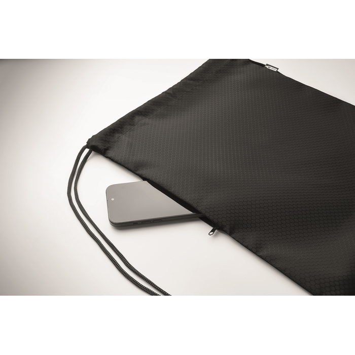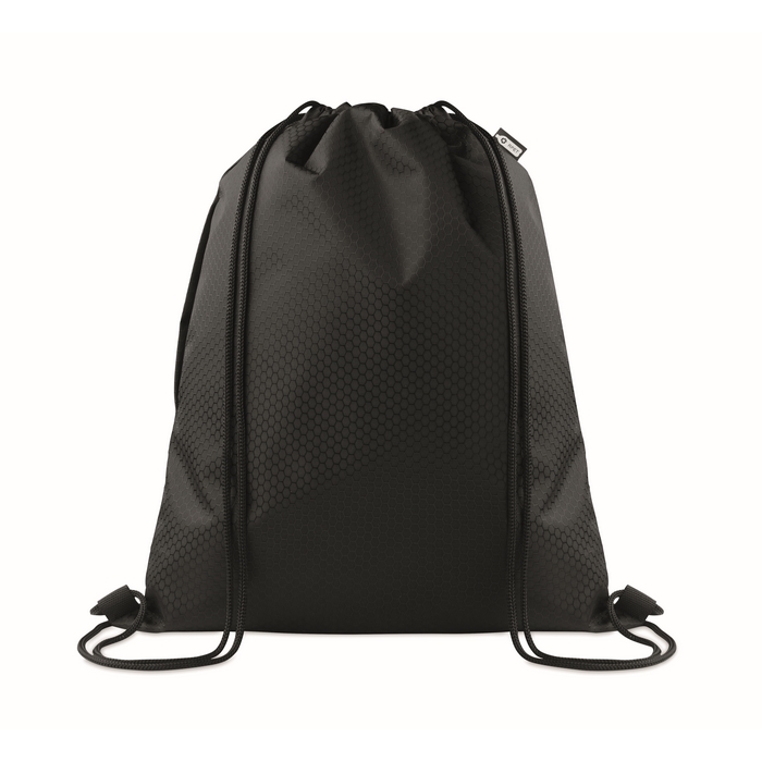 Stahovací batoh z polyesteru RPET 420D s vertikální boční kapsou na zip a podšívkou z materiálu RPET 210D. Pevné šňůrky, objem 4,5 l, maximální nosnost 5 kg. Rozměry: 34 x 42 cm