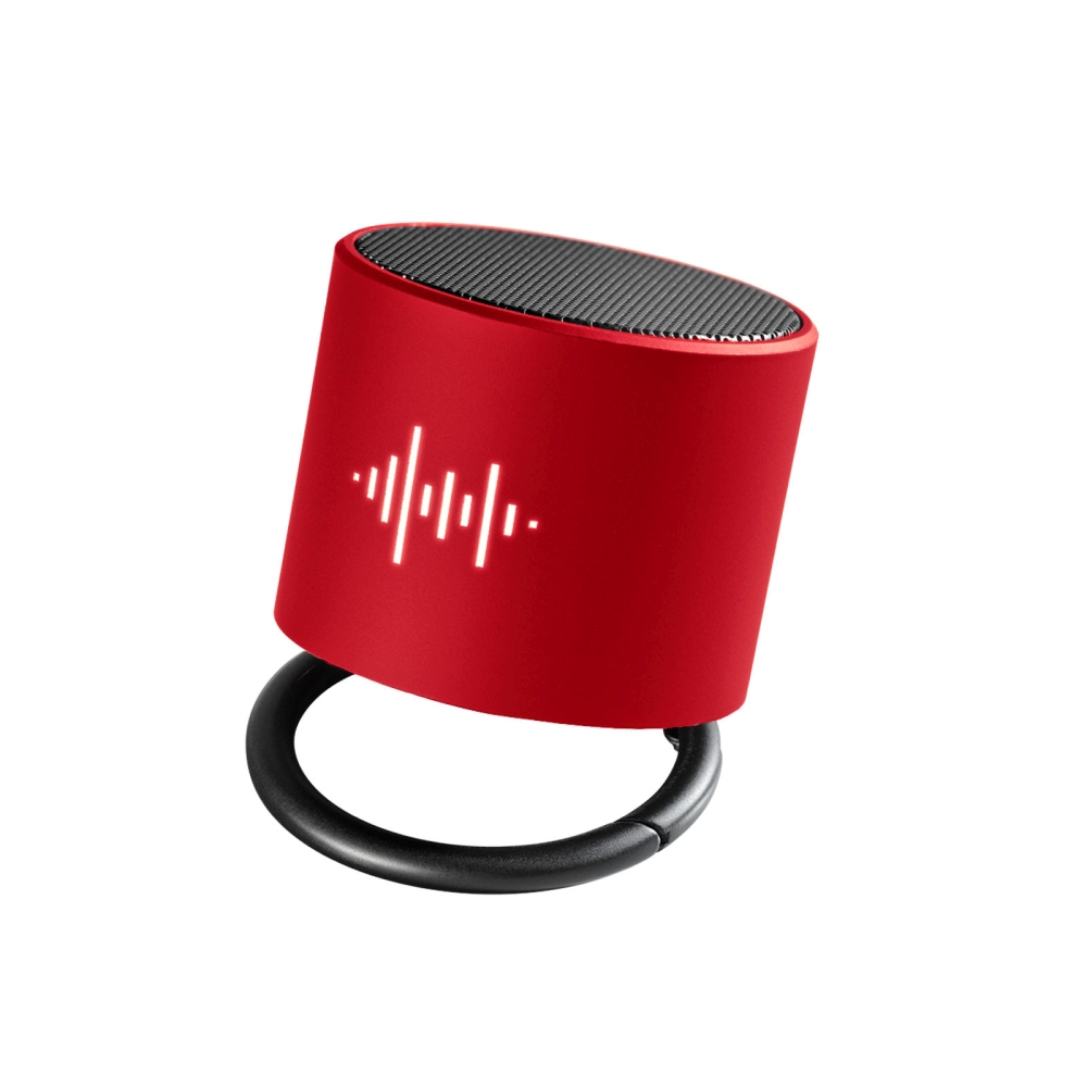 Bezdrátový 3W Bluetooth reproduktor s podsvíceným logem a antimikrobiální vrstvou a dvojitým zvukovým výstupem pro bezkonkurenční kvalitu zvuku u reproduktorů této velikosti. Reproduktor lze naklonit a vést tak zvuk jakýmkoli směrem. Má vestavěnou funkci mikrofonu a konferenčního hovoru. Kapacita: Baterie 500 mAh – 3,7 V. Frekvence: 50 Hz – 20 KHz. Zvukový výstup: 1 × 3 W. Impedance: 4 ?. Bluetooth 4.2. Čistá hmotnost: 100 gramů. Velikost: Ř 50 mm × 45 mm. Dodává se v dárkové krabičce s magnetickým zavíráním, vyrobené z recyklovaného papíru. Rozměry: 4,5 x O 5 cm