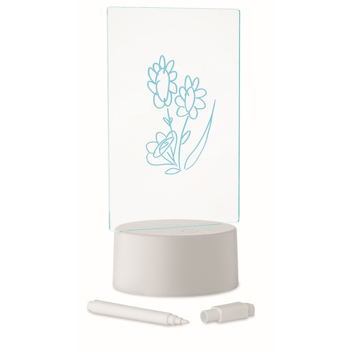 Svítící malá nástěnka LED s měnící se barvou a stíratelným bílým fixem. Akrylová destička a hliníková základna. Napájená bateriemi, vyžaduje 3 x AAA baterie (nejsou součástí balení). Rozměry: 16.1 x 10 x 2.6 cm