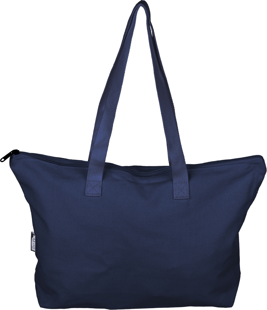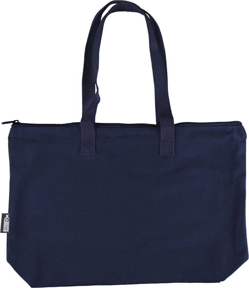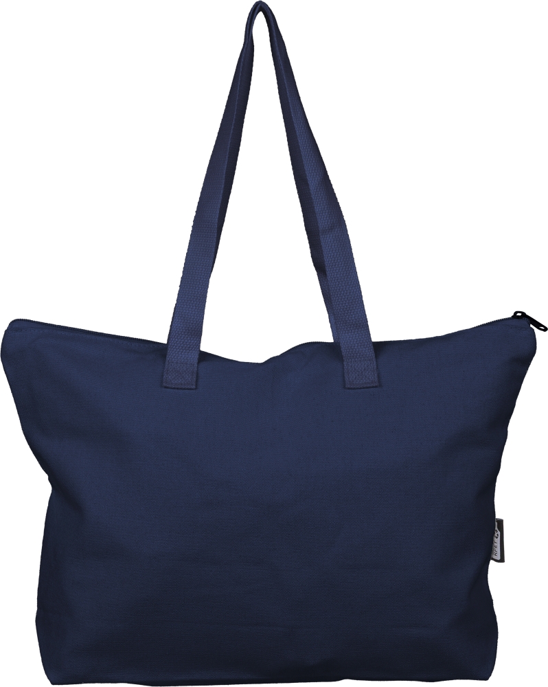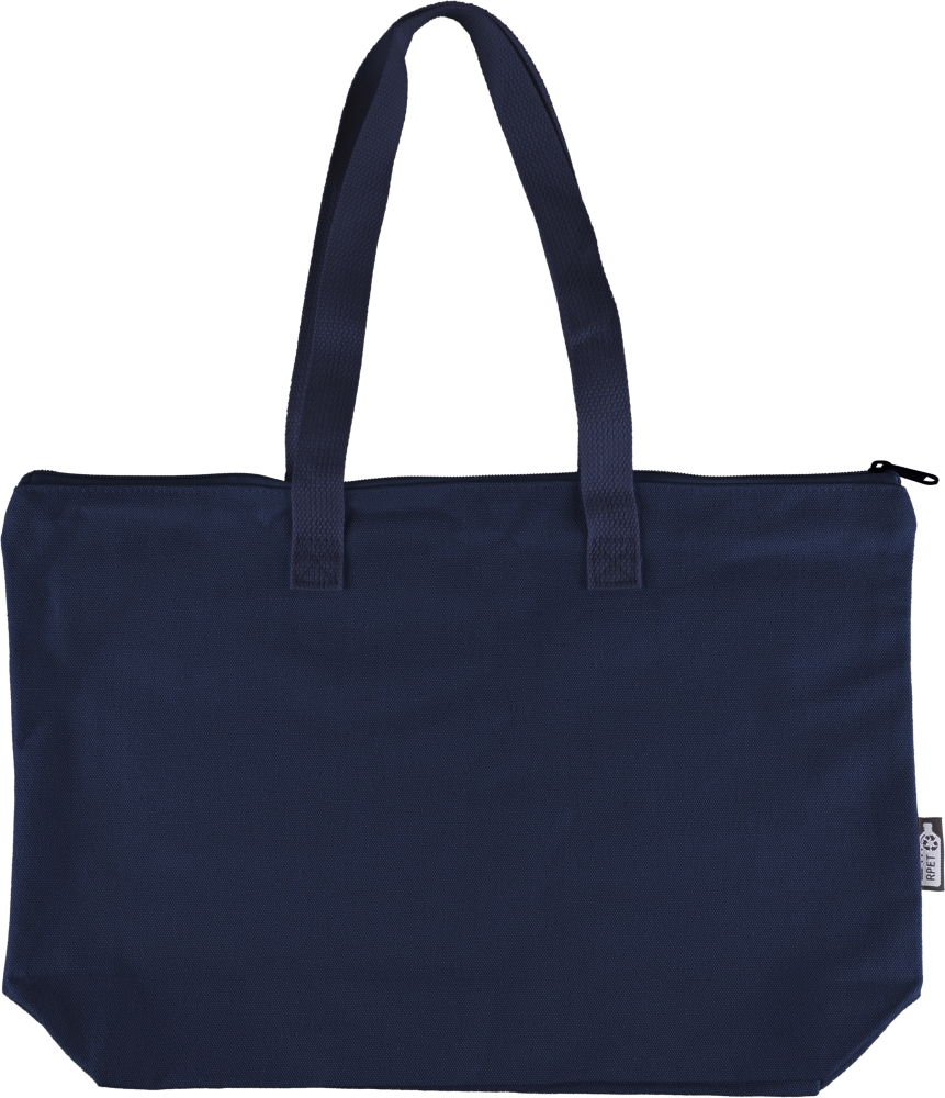 Taška z recyklované polybavlny (330 g/m2) s velkým horním oddílem na zip. S dlouhými uchy pro nošení (délka 65 cm, šířka 2,5 cm) a odpovídajícím popruhem. Včetně štítku z rPET na vnější straně a štítku uvnitř. Rozměry: 30 cm x 45 cm