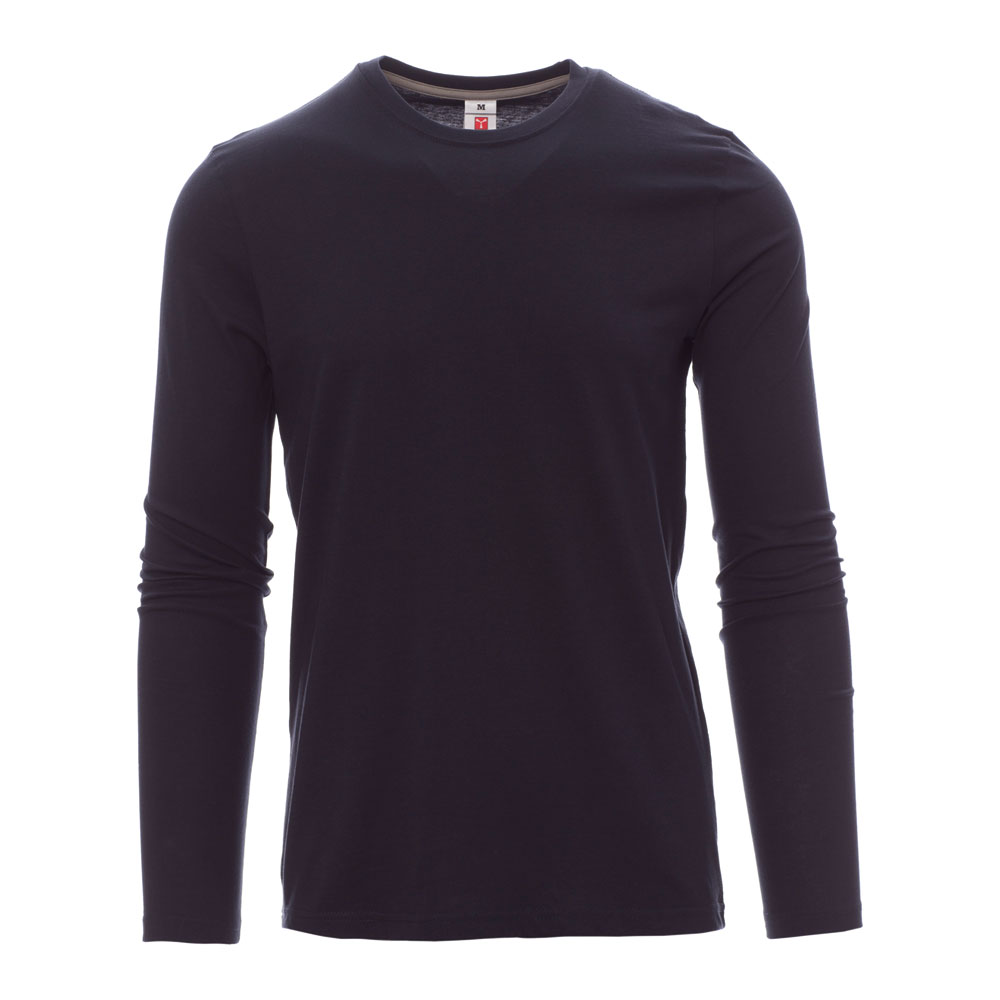 Pánské tričko s dlouhým rukávem a kulatým výstřihem, 1,5 cm pružný žebrovaný lem ze směsi spandex u krku s vrchním prošíváním na přední straně, barevně kontrastní vyztužovací páska od ramene k rameni viditelná na límečku, pružné švy, postranní sešití. Gramáž 165 g/m2. Materiál 100% bavlna.