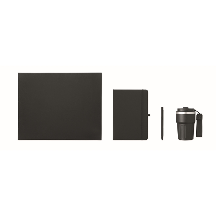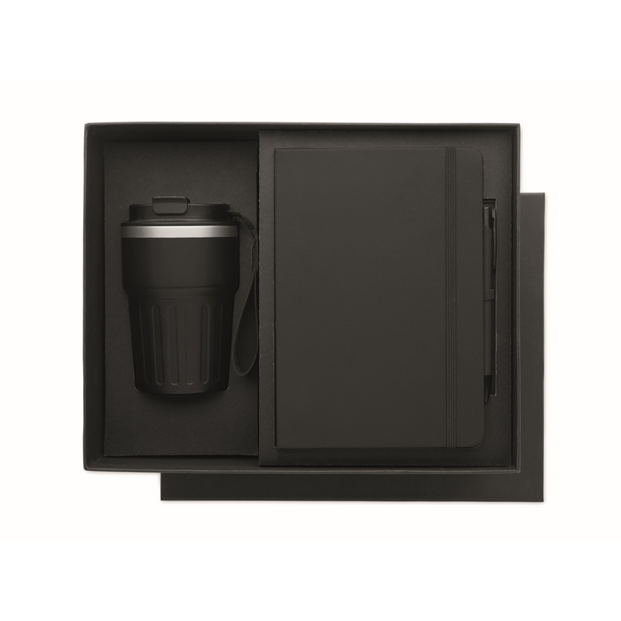 Zápisník A5, kuličkové pero z recyklovaného hliníku a 350 ml termohrnek s PP víčkem a poutkem v dárkové krabičce. Rozměry: 30.4 x 24.6 x 10.5 cm