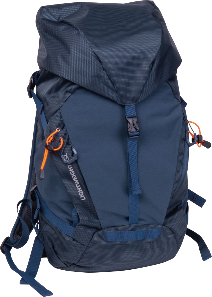 Pevný turistický batoh s ergonomickým bederním pásem, kapacita 25 L, vyrobená z materiálů PA, PES a EVA, skapsami na ochranu před deštěm na spodní straně a na zadním polstrování. Rozměry: 30 x 18 x 56 cm