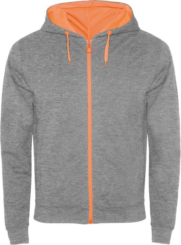 Mikina z nečesaného fleecu se zářivě barevnými detaily. Středový zip s kontrastním táhlem. Kapuce s podšívkou z mikroperforované polyesterové látky v kontrastní zářivé barvě. Stahovací šňůrka a kovová očka v kontrastní zářivé barvě. 1 × 1 žebrované manžety a pas. Dvě přední kapsy s širokým lemem. Zesílené kryté švy na vnitřním límci. Odnímatelný štítek. 60% Bavlna, 40% Polyester, 280 g/m2.