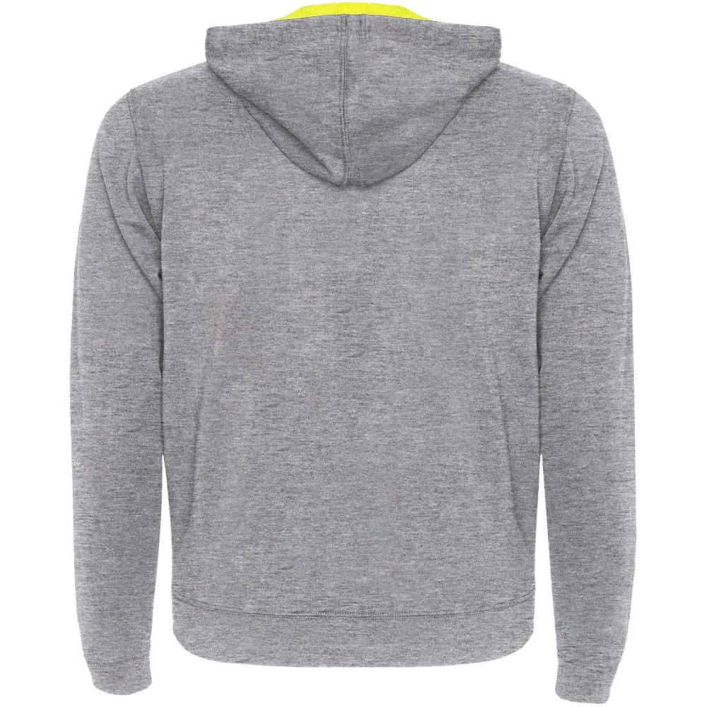 Mikina z nečesaného fleecu se zářivě barevnými detaily. Středový zip s kontrastním táhlem. Kapuce s podšívkou z mikroperforované polyesterové látky v kontrastní zářivé barvě. Stahovací šňůrka a kovová očka v kontrastní zářivé barvě. 1 × 1 žebrované manžety a pas. Dvě přední kapsy s širokým lemem. Zesílené kryté švy na vnitřním límci. Odnímatelný štítek.