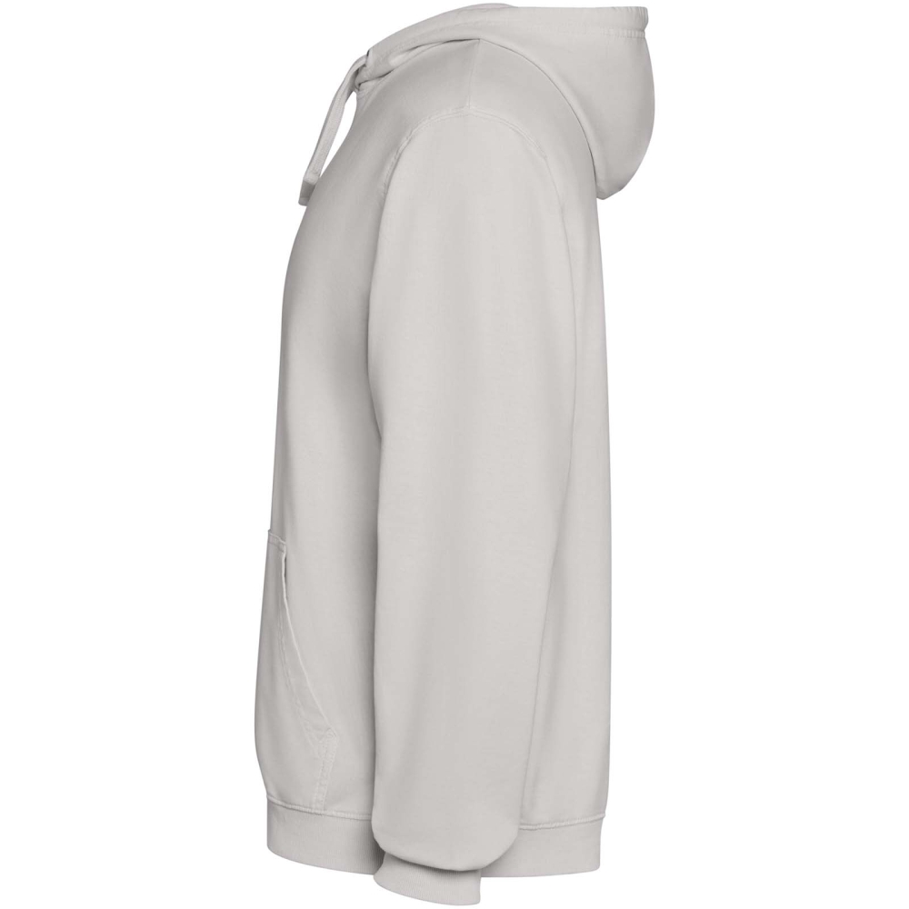 Unisex mikina s kapucí se sepraným vzhledem. Žebrované manžety a lem 2 × 1. Kapuce s podšívkou z jednolícního žerzeje v tónu látky se sladěnými plochými šňůrkami. Krycí steh v tónu látky u krku. Klokaní kapsa.