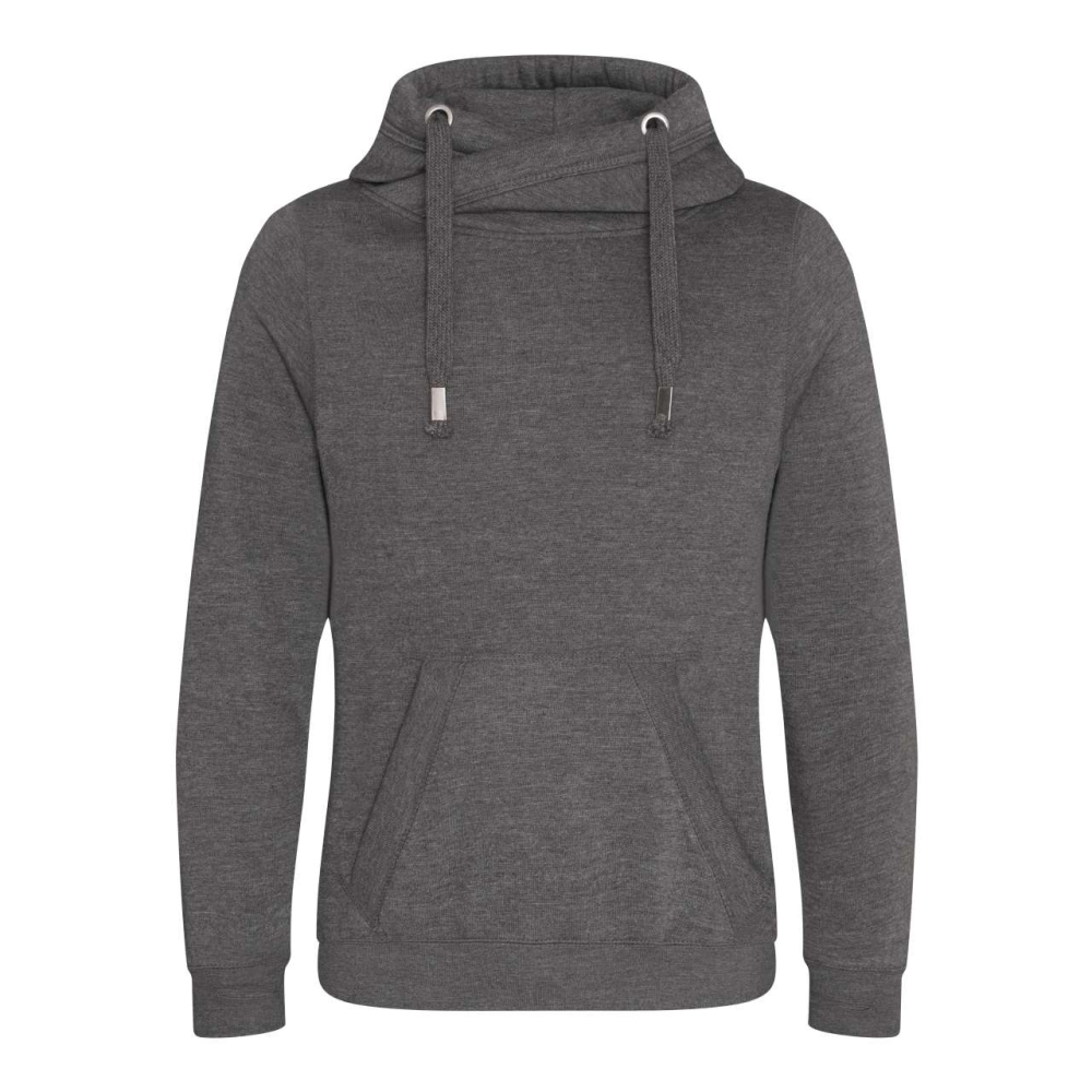 Unisex mikina s kapucí s překřížením u krku, 3dílná dvojitá látková kapucee, ploché tkaničkové stahovací šňůrky, manžety s otvorem pro palec, klokaní kapsa, vnitřní česaný fleece, žebrované manžety a lem, detail prošití dvojitou jehlou. Odtrhávaací etiketa. Materiál 70% prstencová bavlna + 30% polyester.