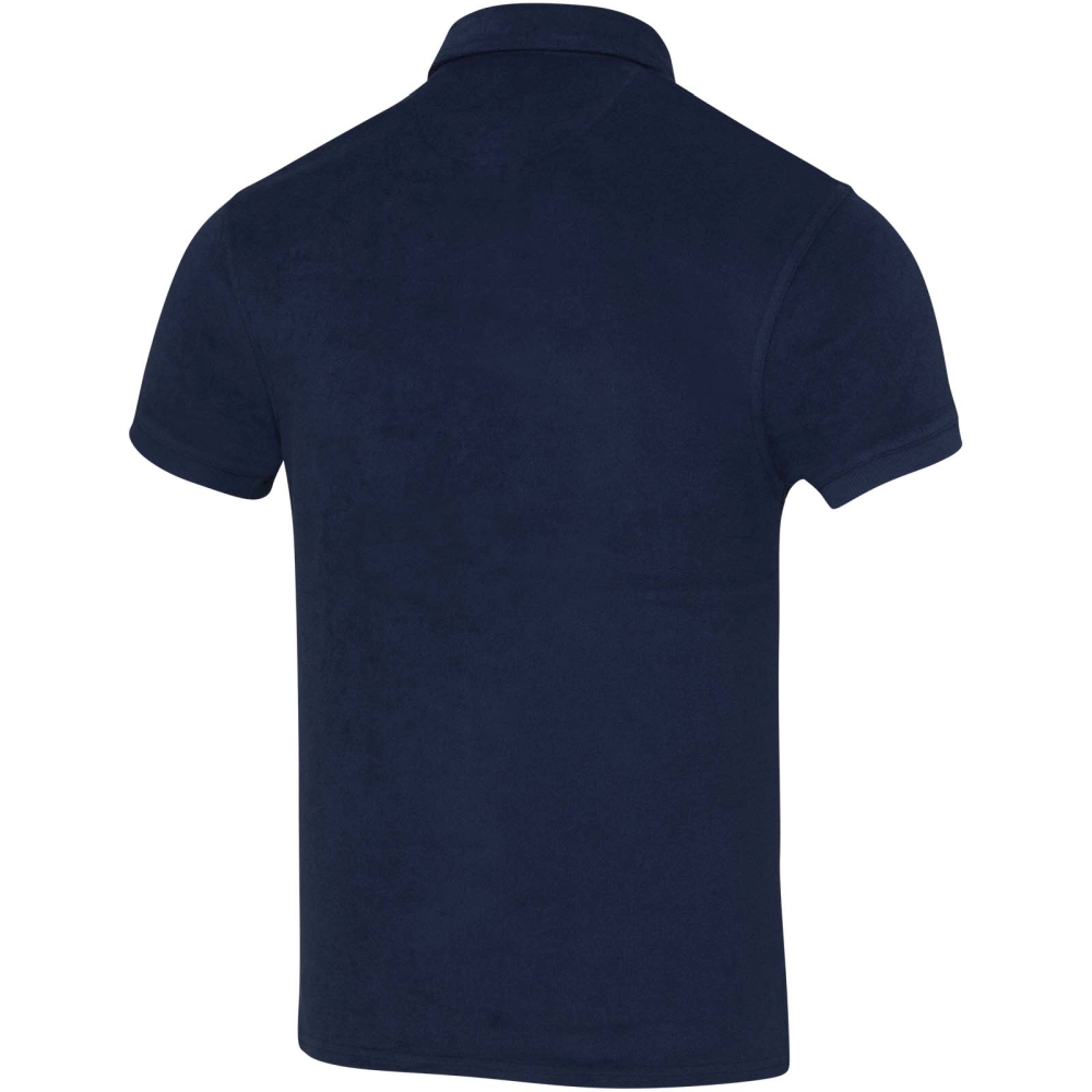 Unisex polo Akoya z recyklovaného froté. Toto polo, vyrobené z měkké froté tkaniny (230 g/m2) z 80% recyklované bavlny a 20% recyklovaného polyesteru, je pocitově lehké a prodyšné, takže se ideálně hodí do teplého počasí. Je navrženo s ohledem na pohodlí i funkčnost, má ležérní střih, žebrované manžety pro nádech elegance a pohodlnou náprsní kapsu.