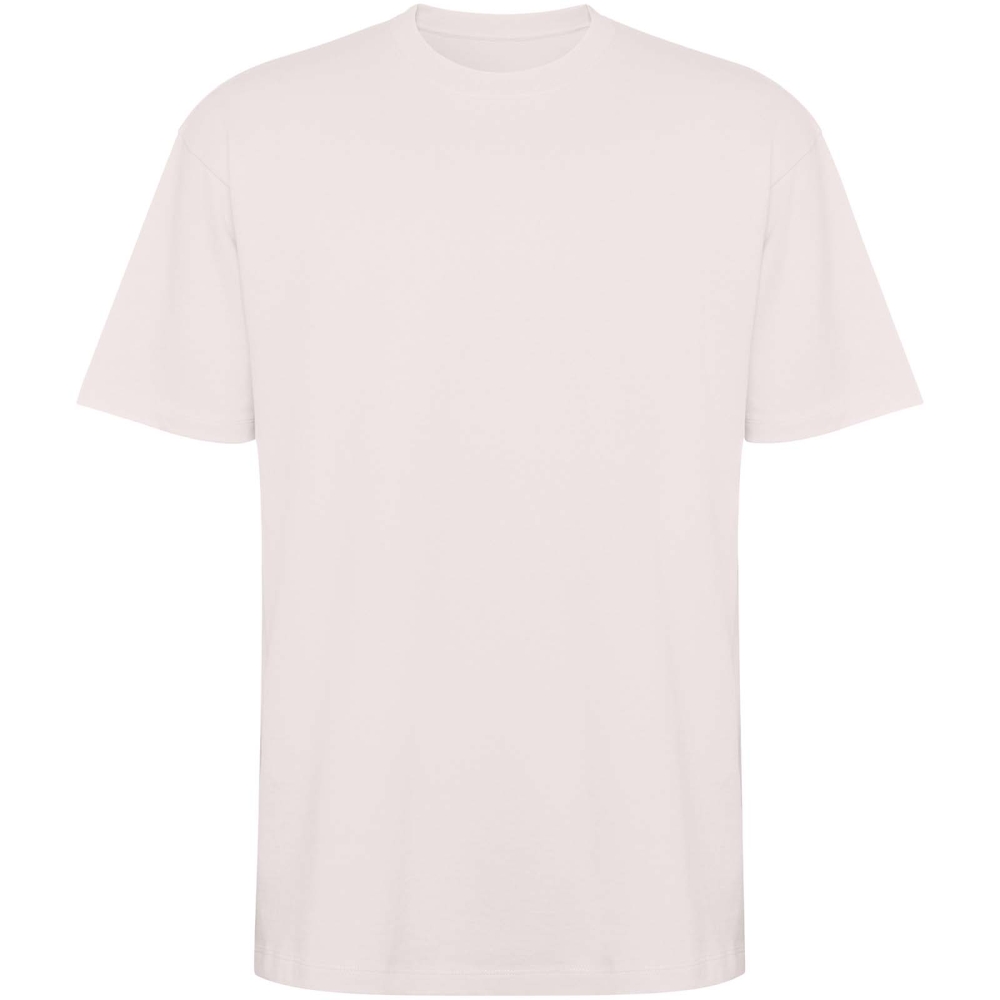 Tričko s krátkým rukávem v nadměrné velikosti. Kulatý límec zdobený 2×1 žebrovým úpletem se sladěnými kryty švů. Boční švy. Široké dvojité prošívání na rukávech a lemu. Odnímatelný štítek.