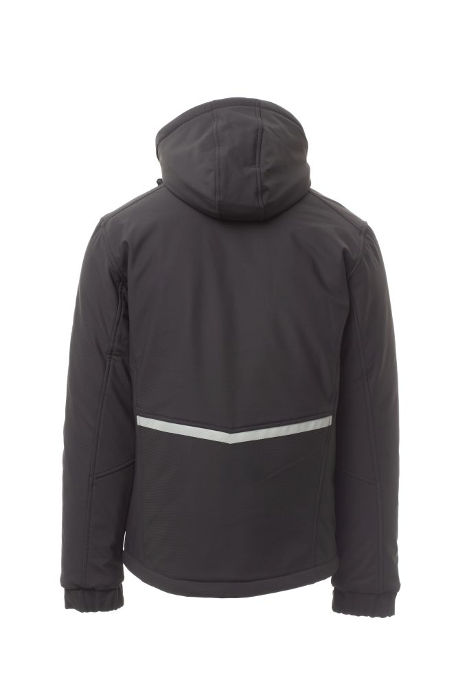 WP 8000 mm H2O, WVT 5000 g/m2 24h. Pánský zateplený softshell, zapínání na zip SBS s kovovým jezdcem „semi-auto lock“ a přizpůsobeným taháčkem. Odnímatelná kapuce se stahovací šňůrkou. Vnitřní límec s flísovými bočními prvky. Reflexní pruhy na zádech a zadní straně kapuce. Elastické stahovací manžety na suchý zip. Dvě boční kapsy na zip, jedna kapsa na hrudi s voděodolným zipem a jedna kapsa na levé paži s integrovaným očkem na pero na zip. Fluorescentní taháčky. Jedna vnitřní prostřižená kapsa na suchý zip. Spodní část stažitelná pomocí přizpůsobených zarážek.