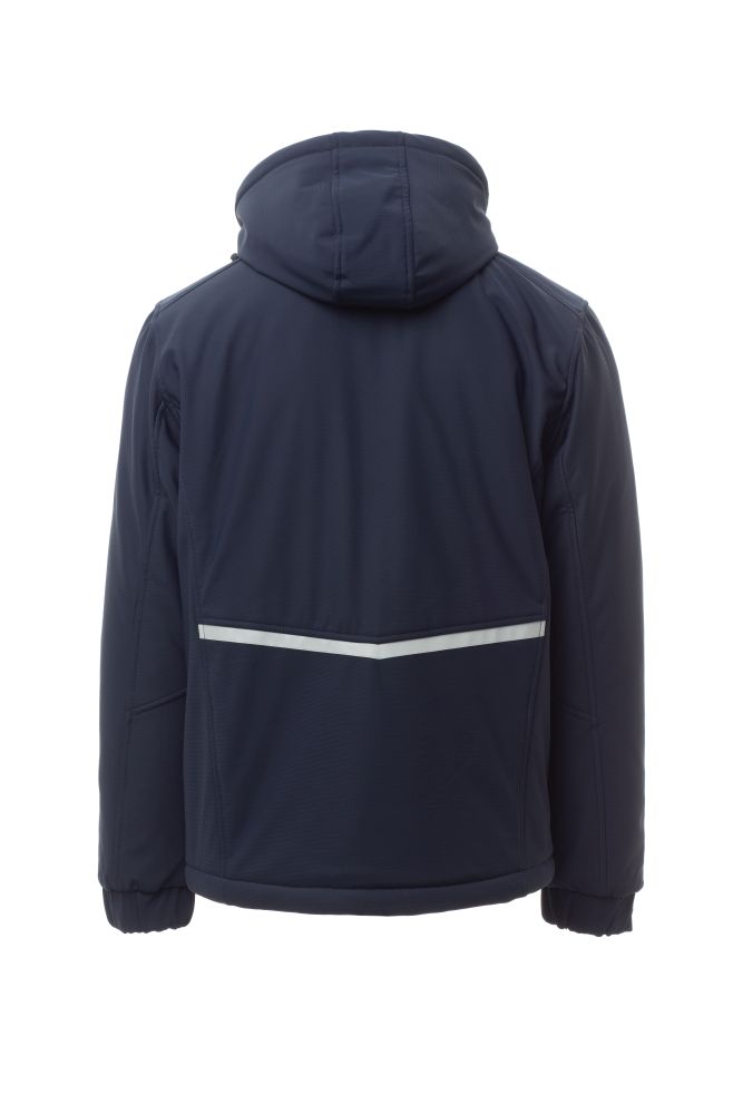 WP 8000 mm H2O, WVT 5000 g/m2 24h. Pánský zateplený softshell, zapínání na zip SBS s kovovým jezdcem „semi-auto lock“ a přizpůsobeným taháčkem. Odnímatelná kapuce se stahovací šňůrkou. Vnitřní límec s flísovými bočními prvky. Reflexní pruhy na zádech a zadní straně kapuce. Elastické stahovací manžety na suchý zip. Dvě boční kapsy na zip, jedna kapsa na hrudi s voděodolným zipem a jedna kapsa na levé paži s integrovaným očkem na pero na zip. Fluorescentní taháčky. Jedna vnitřní prostřižená kapsa na suchý zip. Spodní část stažitelná pomocí přizpůsobených zarážek.