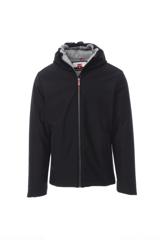 WP 8000 mm H2O, WVT 3000 g/m2 24h. Pánská soft-shellová zateplená bunda s kapucí, plastovým celozipem SBS s kovovým jezdcem s aretací „semi-autolock“, dvě vnější kapsy na zip, jedna vnitřní kapsa na zip.