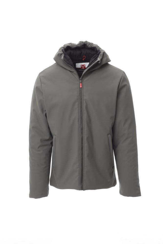 WP 8000 mm H2O, WVT 3000 g/m2 24h. Pánská soft-shellová zateplená bunda s kapucí, plastovým celozipem SBS s kovovým jezdcem s aretací „semi-autolock“, dvě vnější kapsy na zip, jedna vnitřní kapsa na zip.