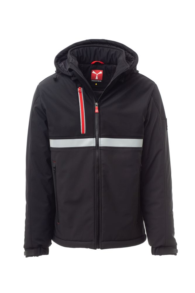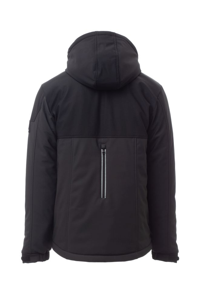WP 8000 mm H2O, WVT 5000 g/m2 24h. Pánský zateplený softshell, zapínání na zip SBS s kovovým jezdcem „semi-auto lock“ a přizpůsobeným taháčkem. Odnímatelná kapuce se stahovací šňůrkou. Přední reflexní pruh na hrudi. Elastické stahovací manžety na suchý zip a vnitřní manžetka. Dvě boční kapsy na zip a jedna kapsa na hrudi na zip s reflexním prvkem. Prvek „life-saving“ na zadní straně, s vnitřním reflexním logem a zapínáním na zip. Dvě vnitřní kapsy: jedna tvarovaná na zip na pravé straně hrudi a jedna na tablet se zapínáním na suchý zip. Spodní část stažitelná pomocí přizpůsobených zarážek.