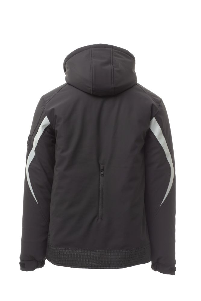 WP 8000 mm H2O, WVT 5000 g/m2 24h. Pánský zateplený softshell, zapínání na zip SBS s kovovým jezdcem „semi-auto lock“ a přizpůsobeným taháčkem. Odnímatelná kapuce se stahovací šňůrkou. Reflexní pruh na ramenou a pažích. Elastické stahovací manžety na suchý zip a s vnitřní manžetou. Kapsa na hrudi Lock System s klopou a očkem na pero. Dvě boční kapsy s voděodolným zipem. Prvek „life-saving“ na zadní straně, s vnitřním reflexním logem a voděodolným zipem. Dvě vnitřní kapsy, z nichž jedna na tablet se zapínáním na suchý zip a druhá tvarovaná na zip na pravé straně hrudi. Spodní část stažitelná pomocí přizpůsobených zarážek. Tečkovaná tkanina s reflexním efektem.