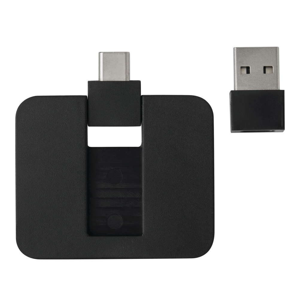 USB hub se 2 porty USB 2.0 a 2 porty USB typu C, kombinovaný a skládací vstupní konektor USB typu A / typu C, plastové pouzdro. Rozměry: 4,3 x 5,2 x 1 cm
