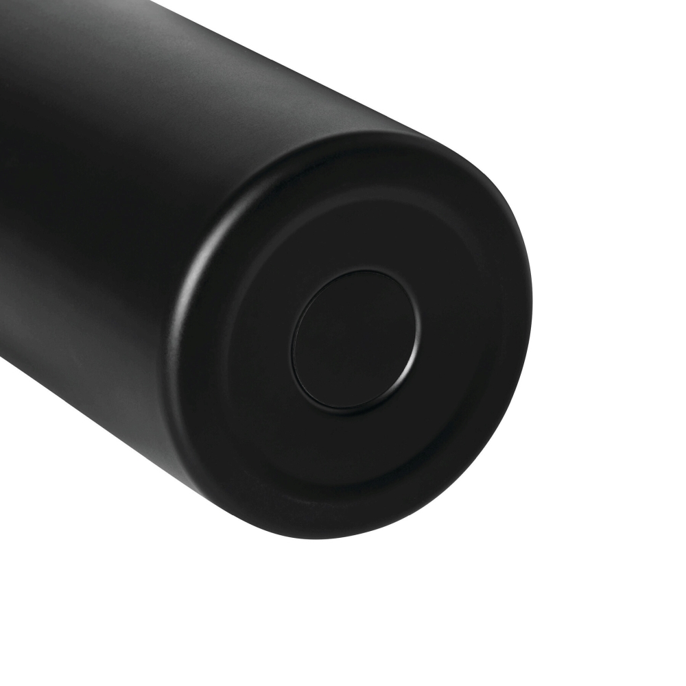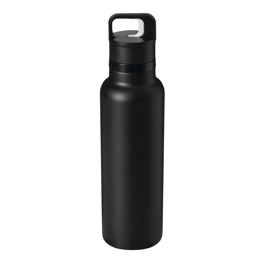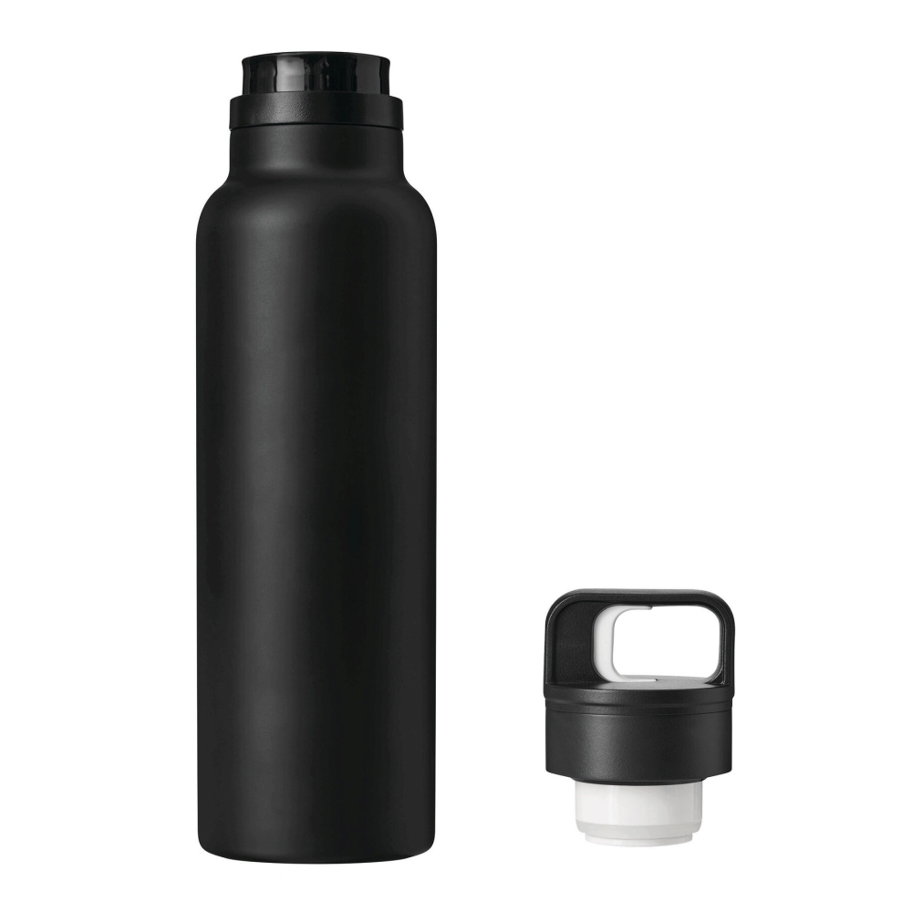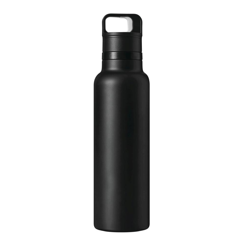 Vakuově izolovaná láhev na pití, dvoustěnná: uvnitř i vně z nerezové oceli, černý plastový uzávěr s jednoručním zapínáním, silikonový těsnicí kroužek a rukojeť pro přenášení, objem cca 750 ml, udrží teplé nápoje cca 8 hodin a studené až 12 hodin, baleno v dárkové krabičce. Rozměry: O7,8 x 29 cm