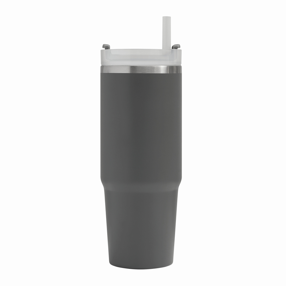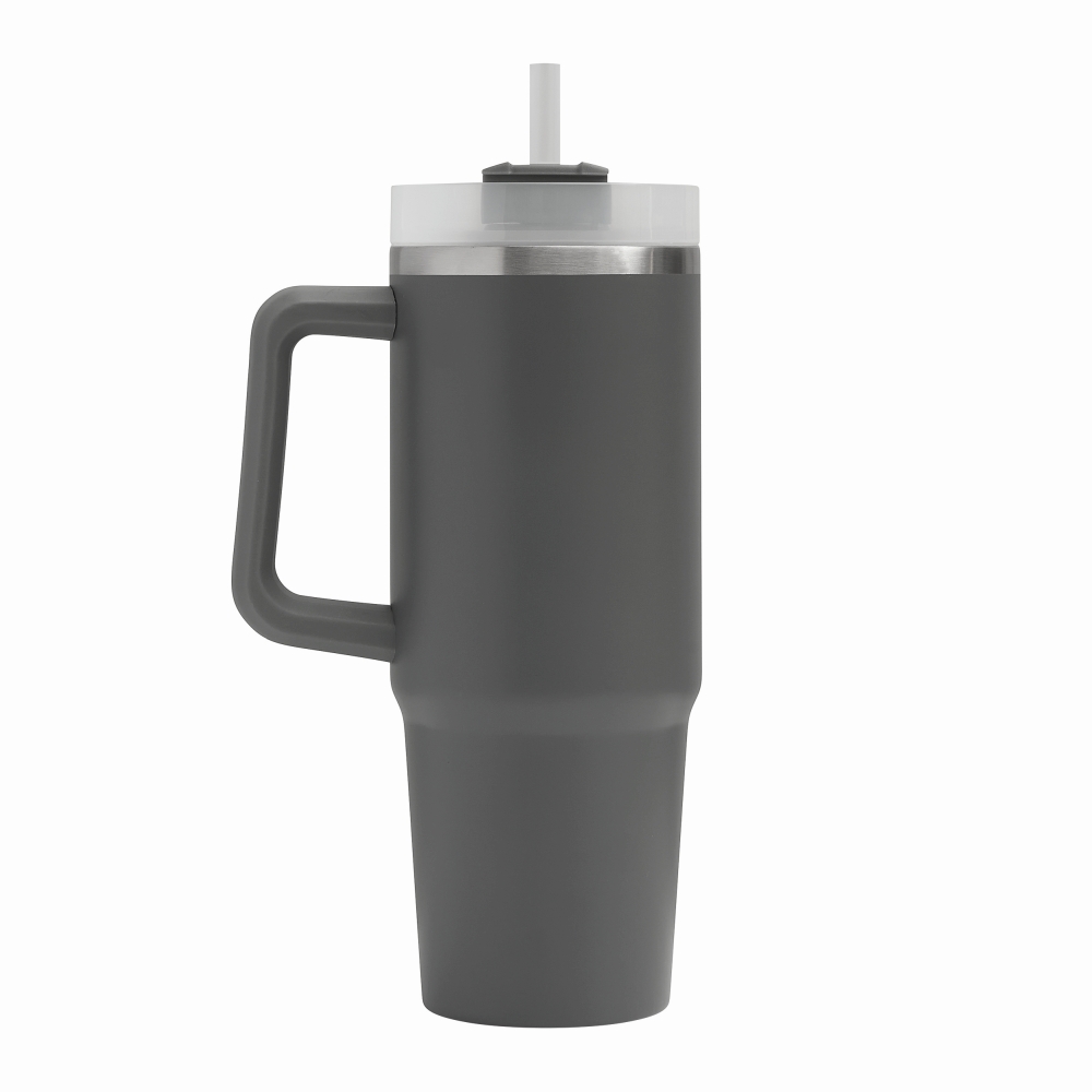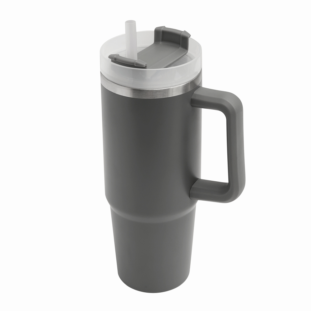 Vakuový kelímek na pití z nerezové oceli, s praktickým držadlem, průhledným plastovým víčkem s bezpečným šroubovacím uzávěrem, silikonovým těsnícím kroužkem, otvorem na pití se šroubovacím uzávěrem a průhledným brčkem, objem 900 ml. Rozměry: o 8,8 x 24 cm