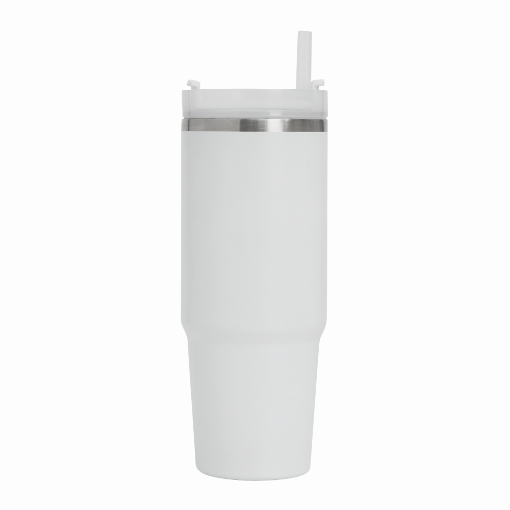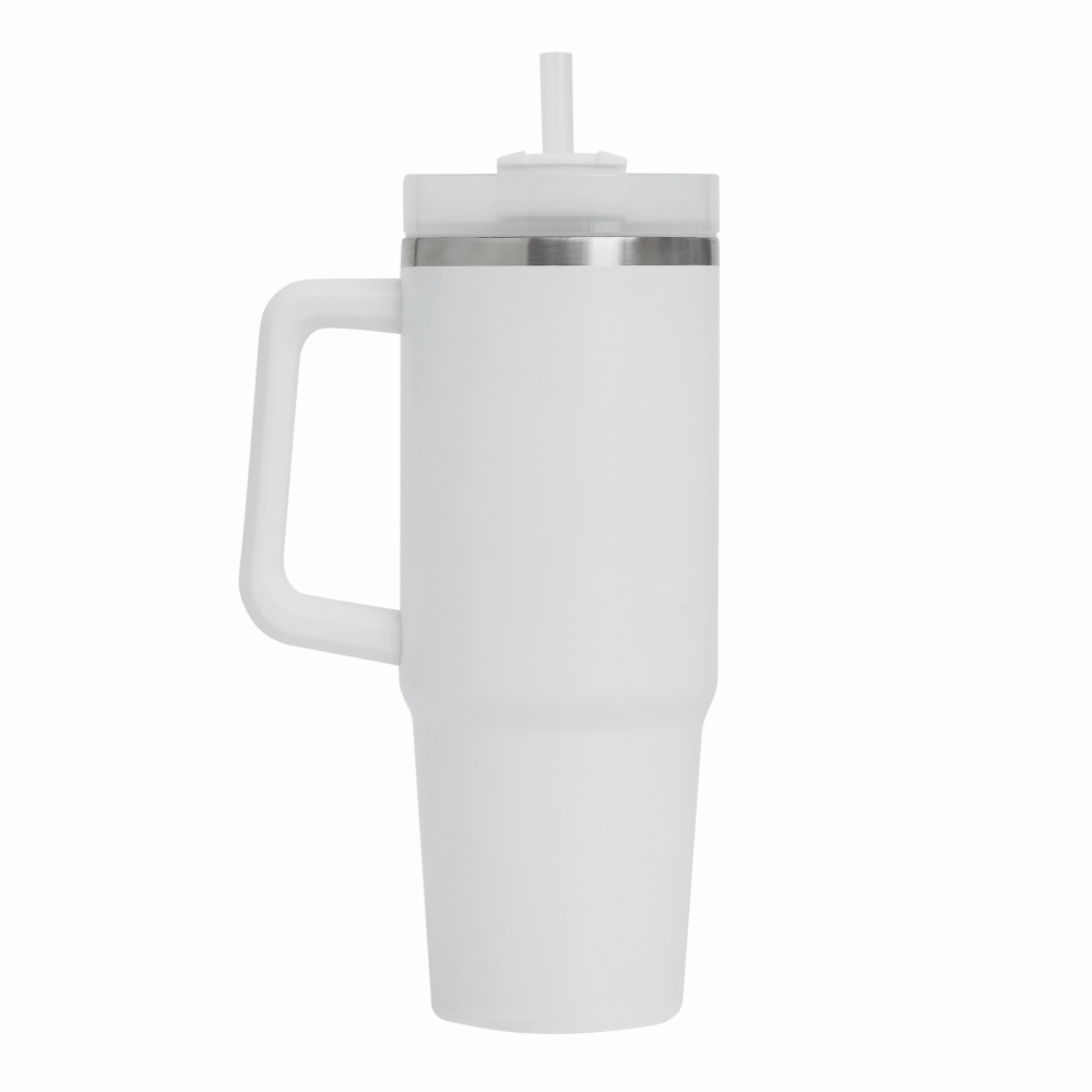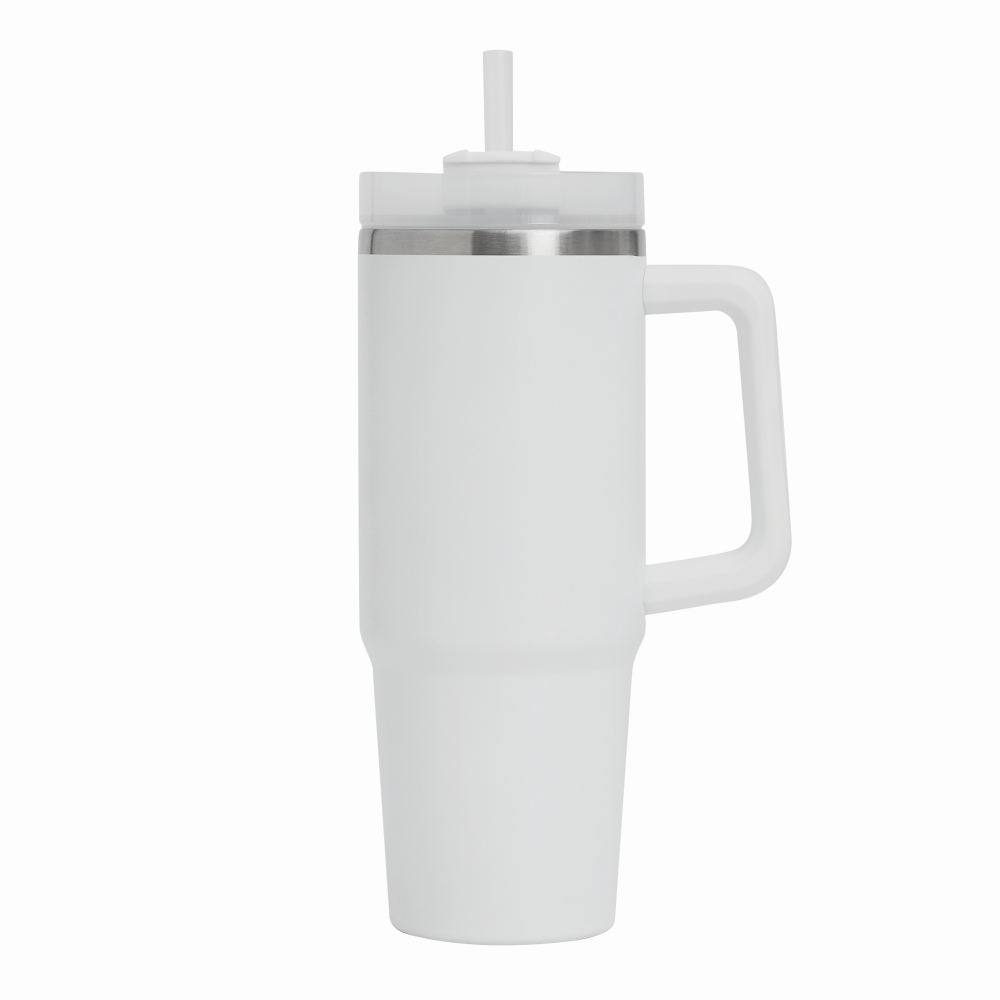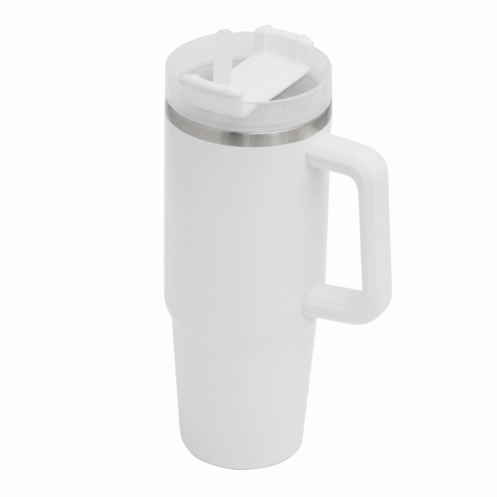 Vakuový kelímek na pití, dvoustěnný: uvnitř i vně z nerezové oceli, s praktickým držadlem, průhledným plastovým víčkem s bezpečným šroubovacím uzávěrem, silikonovým těsnícím kroužkem, otvorem na pití se šroubovacím uzávěrem a průhledným brčkem, kapacita cca. 900 ml. Rozměry: O8,8 x 24 cm