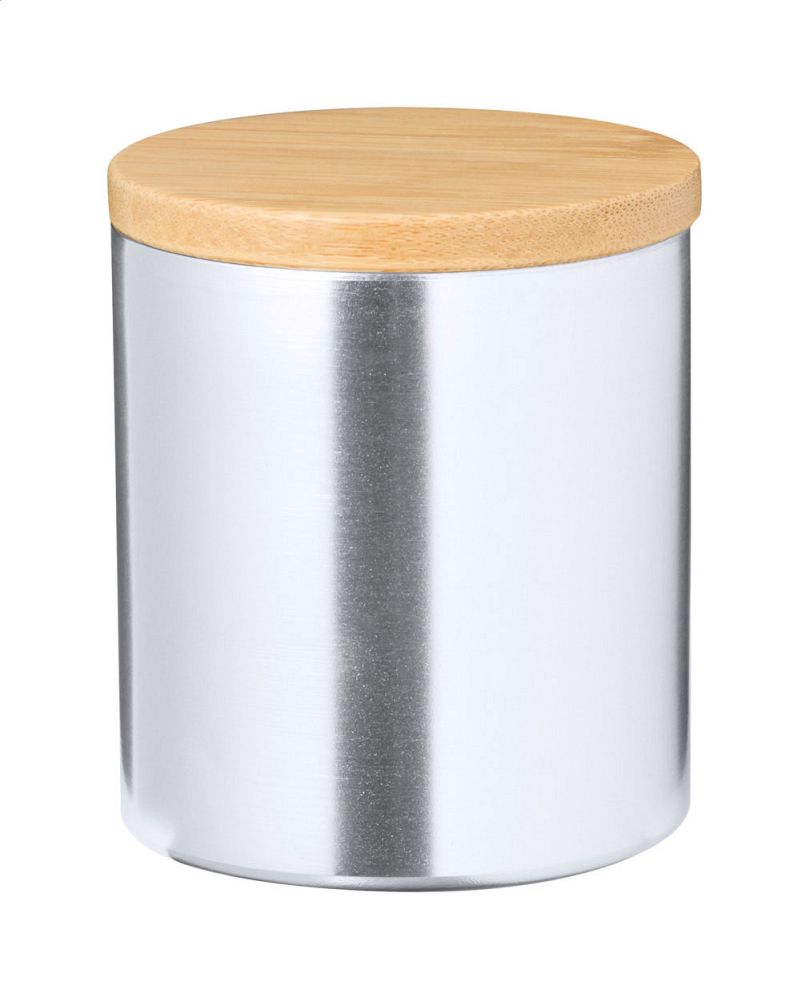 Vanilková vonná svíčka v hliníkovém držáku s bambusovým víčkem. Rozměry: o 6,5 × 7,5 cm.