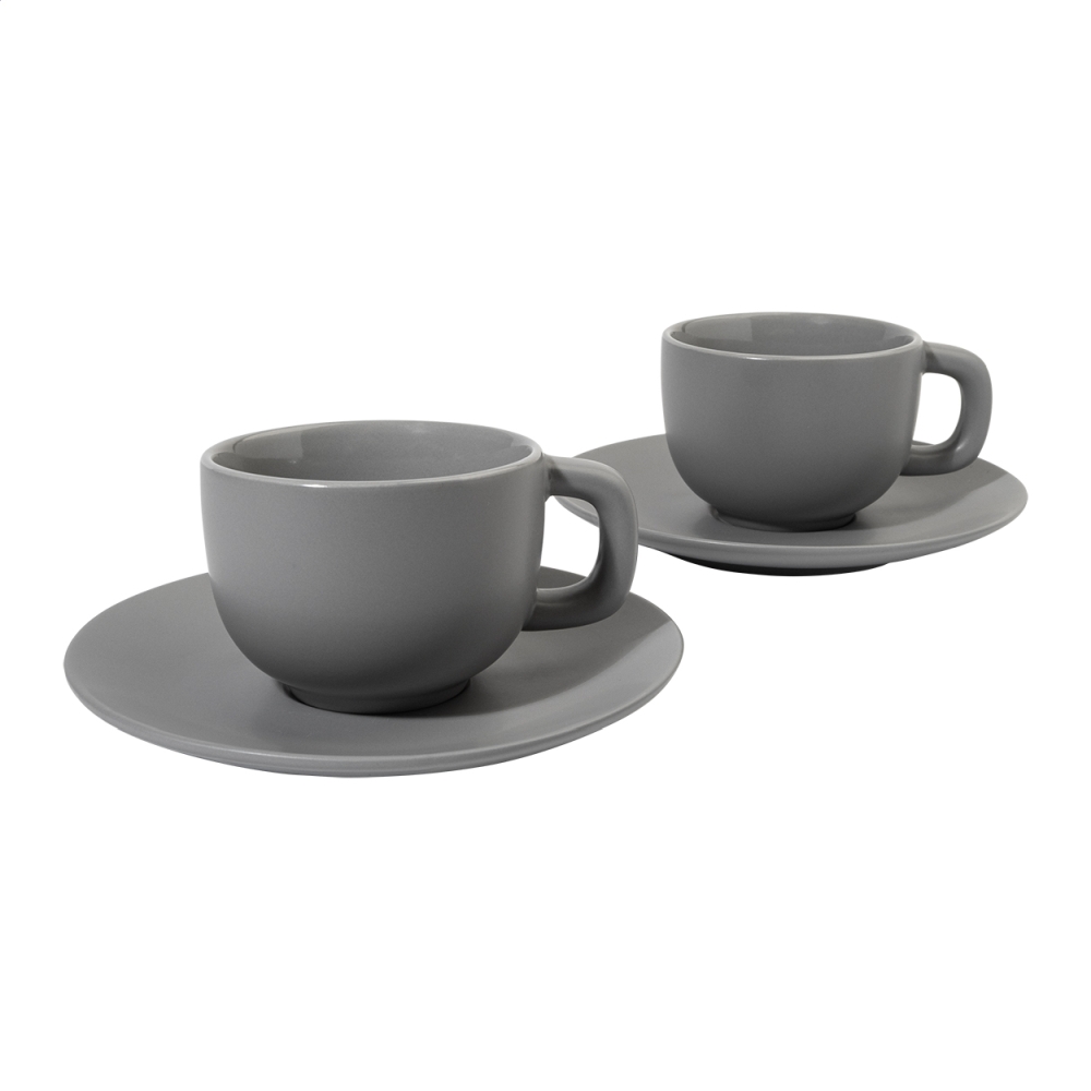 Sada dvou keramických šálků a podšálků na cappuccino. S matnou vnější a lesklou vnitřní povrchovou úpravou. Objem 200 ml. Dodáváno v krabičce. Rozměry: 16 × 16 × 11 cm.