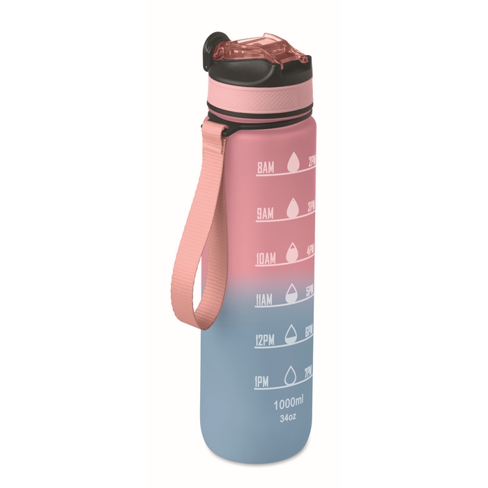 Sportovní RPET láhev na vodu s integrovaným brčkem, měkkým silikonovým náustkem, motivačním časovým značením, víčkem otevíratelným jednou rukou, bezpečnostním zámkem a popruhem na přenášení. Objem 1 l. Rozměry: O7 x 28 cm