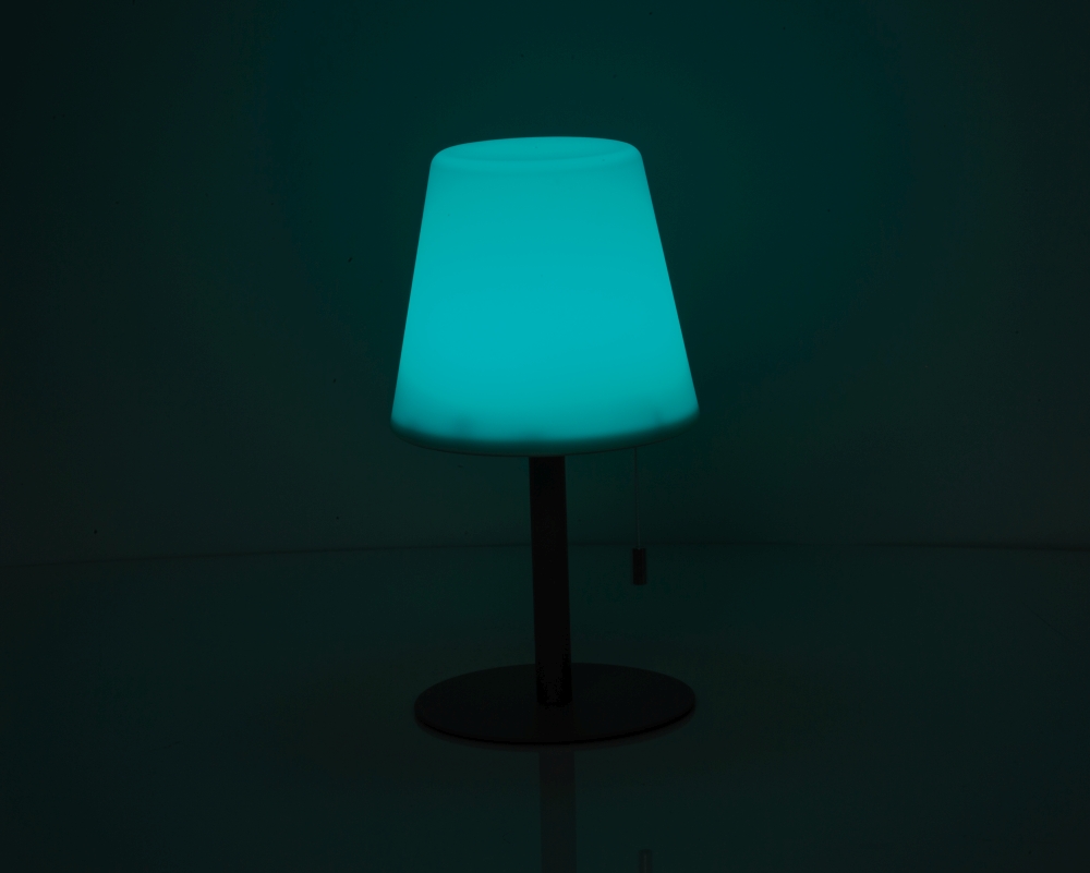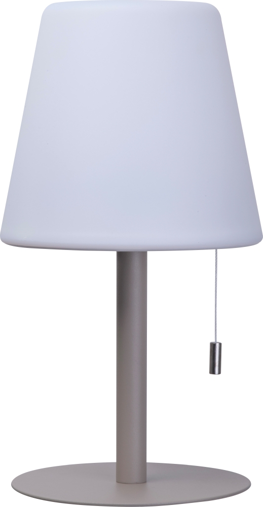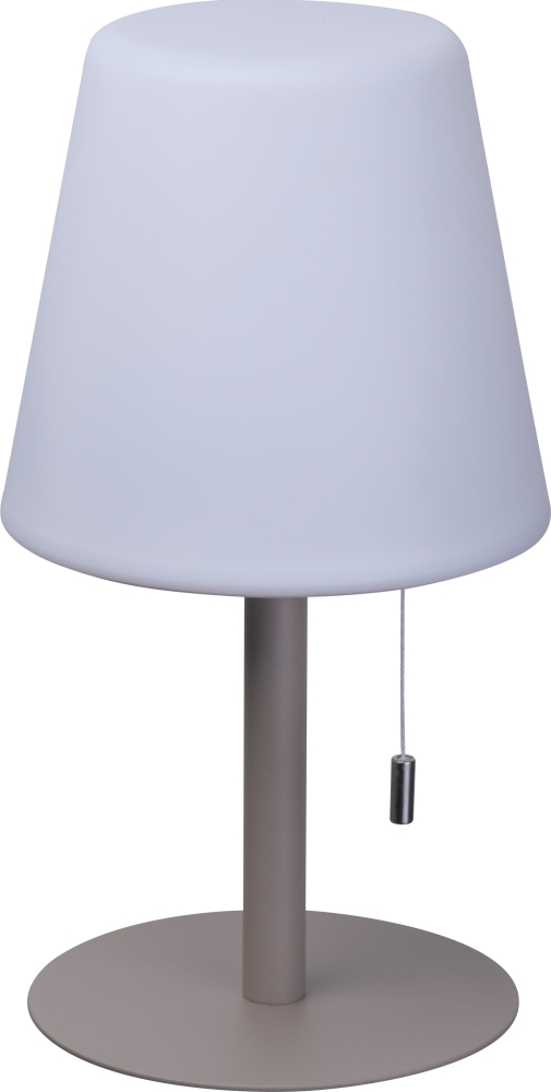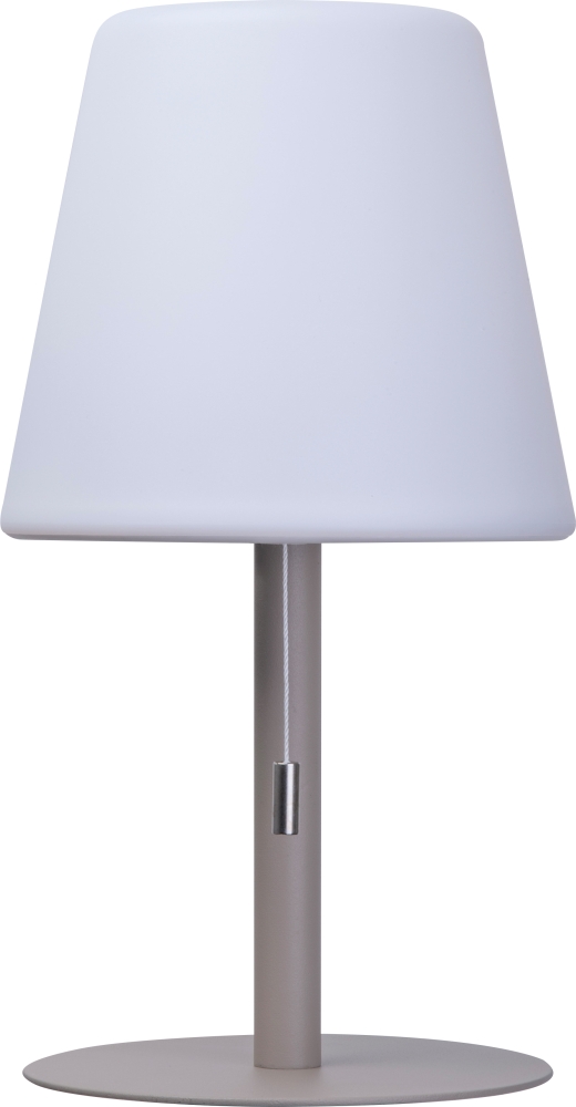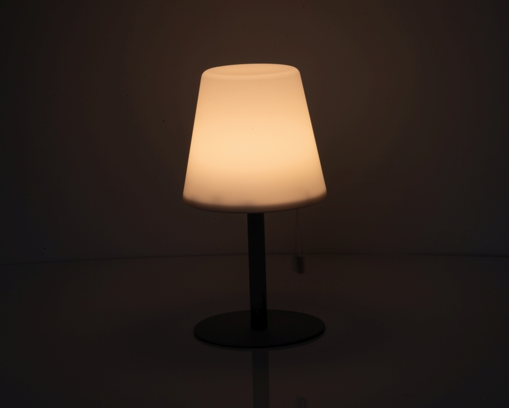 Středně velká venkovní lampa se změnou barvy a moderním designem, O 16,5 × 30 cm, výdrž 8–10 hodín, 3,7 V, 2 × dobíjjecí baterie 1 200 mAh, stínítko z PP, kovová základna. Vytváří útulnou atmosféru. Rozměry: o 16,5 x 30 cm