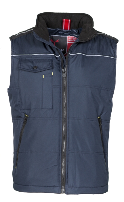 Prošívaná vesta s podšívkou a reflexním proužkem na hrudi a na zádech, kapsou na telefon na hrudi s přihrádkou na tužku, dvěma velkými kapsami na zip a vnitřní kapsou. Materiál: pongee 100% polyester, 175grm.