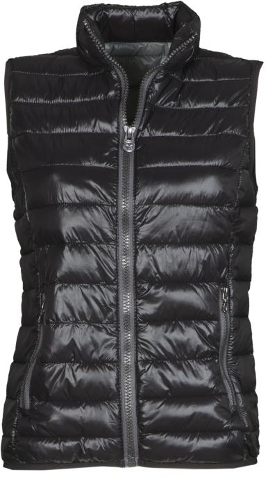 Dámská prošívaná vesta s šedou podšívkou, celopropínací, 2 vnější kapsy na zip, 2 vnitřní kapsy, 100% nylon s lesklou povrchovou úpravou, uvnitř polyester - imitace peří. Kovové zipy s pogumovaným povrchem. Doporučená technologie tisku: sítotisk S3, výšivka.