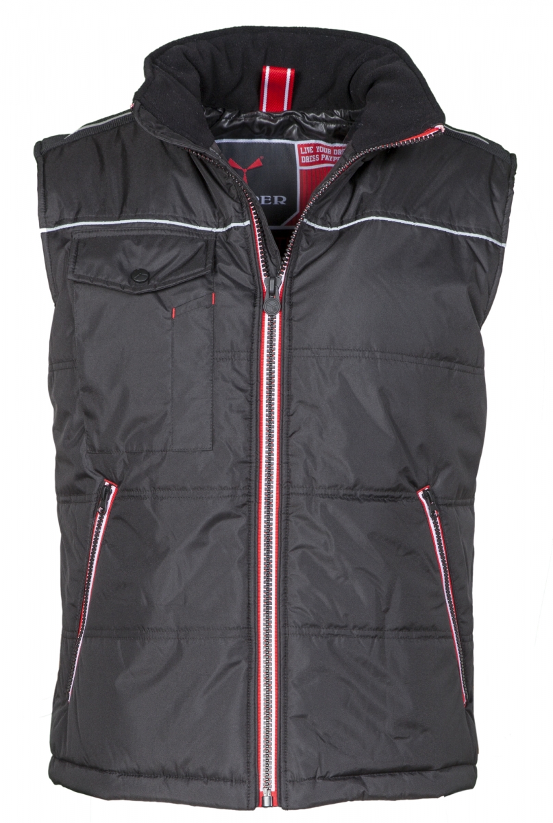Prošívaná unisexová vesta s kontrastním zipem, tvarovaná záda, dvě velké vnější kapsy na zip, velká náprsní kapsa na telefon a upínací kroužek na jmenovku, reflexní lemování na prsou a na ramenech, zateplení, materiál podšívky s vysokou hustotou, vnitřní fleecový límec, jedna vnitřní kapsa. Materiál 100 % polyester, 175 g/m2.