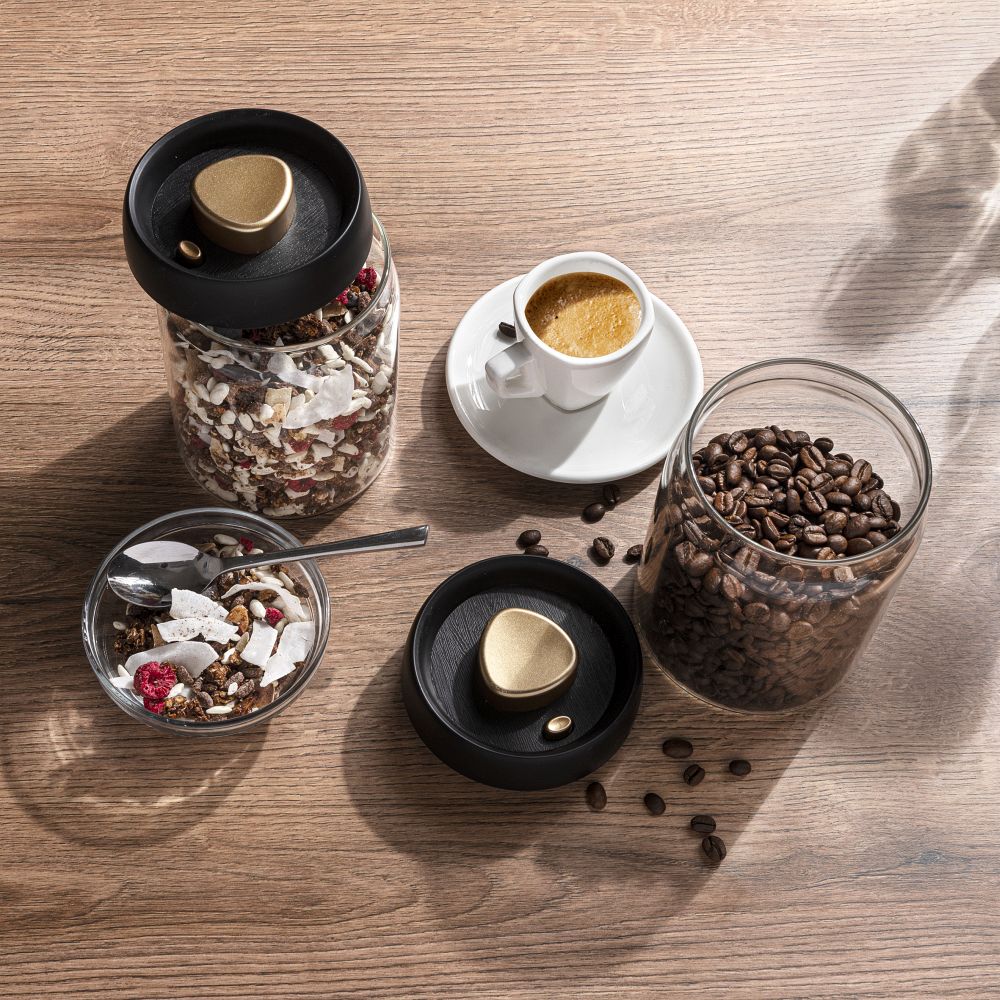 Praktická vakuová dóza z borosilikátového skla, která je skvělým doplňkem každé kuchyně. V dóze lze uchovávat zrnka kávy, sypaný čaj, müsli a jiné potraviny, které díky vakuovému víčku udrží svoji čerstvost po delší dobu. Obsah dózy je 900 ml. Baleno v dárkové krabičce Vanilla Season. Rozměry: O 10,2 × 14 cm, balení 11 × 16 × 11 cm.