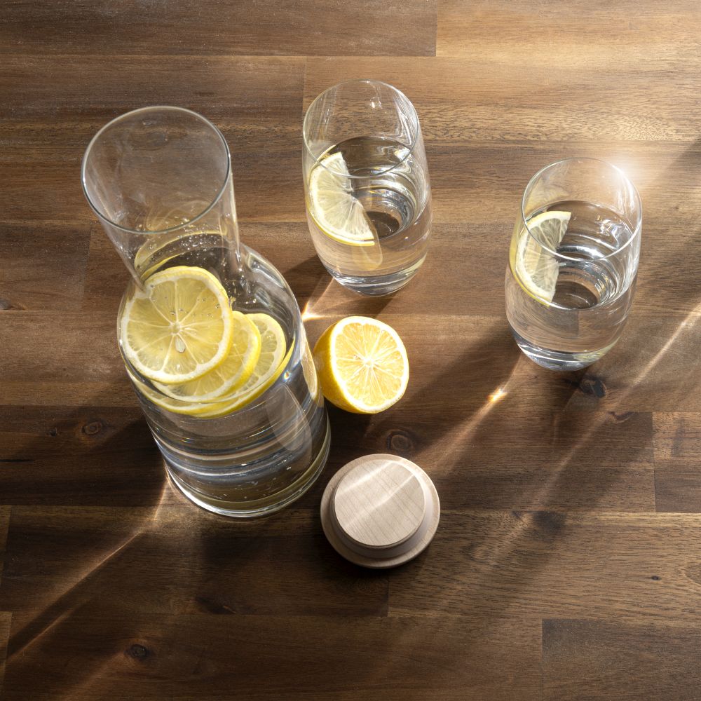 Elegantní sada skleněné karafy a 2 vysokých sklenic Bohemia Crystal. Karafa obsahuje dřevěnou zátku a má objem 1,2 l, objem sklenic je 350 ml. Tuto sadu oceníte především v horkých letních dnech například pro přípravu svěží pramenité vody či výborné citronády, ale i pro každodenní pitný režim. Baleno v dárkové krabici Vanilla Season. Rozměry: sklenice O 7,3 × 15,2 cm, karafa O 9,5 × 31 cm, balení 37,5 × 11 × 34 cm.