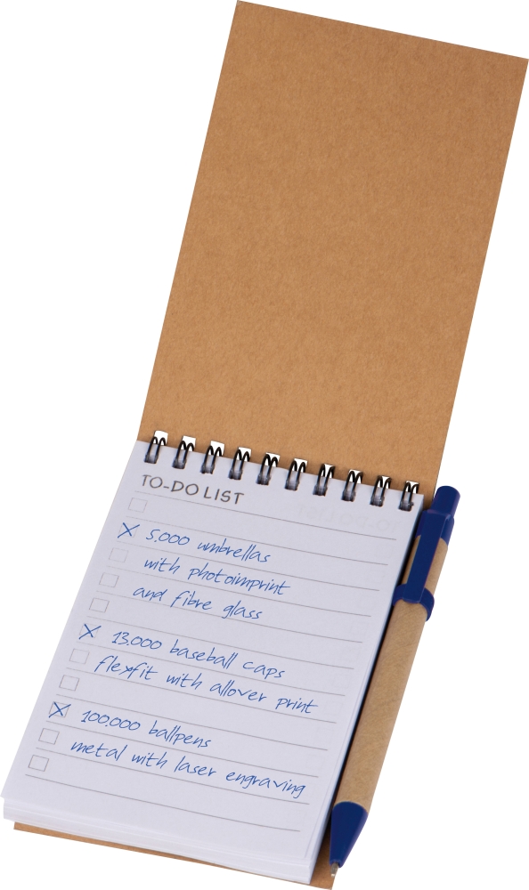 Poznámkový blok se spirálovým vázáním a ekologickým obalem, obsahuje 70 stran označených: "To do List" a propiska, abyste na nic nezapomněli. Rozměry: 9 x 14,4 x 0,9 cm