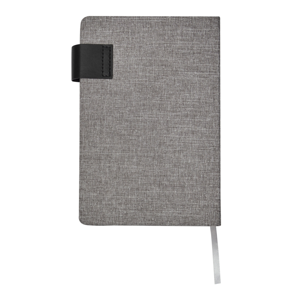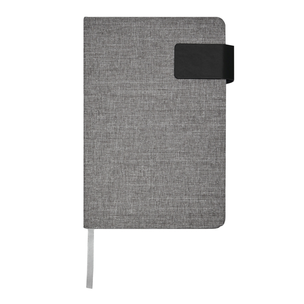 Poznámkový blok A5 se zaoblenými rohy, magnetické zapínání, s integrovanou záložkou, obal z recyklovaného polyesteru, 80 stran, linkovaný, 70 g/m2. Rozměry: 21,5 x 14,3 x 1,4 cm