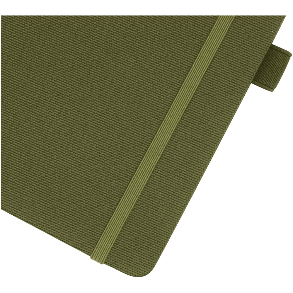 Zápisník formátu A5 s obálkou z látky s RPET. Obsahuje 80 listů linkovaného recyklovaného papíru 70 g/m2 se stuhovou záložkou a očkem na pero. Rozměry: 21,5 x 14,5 cm