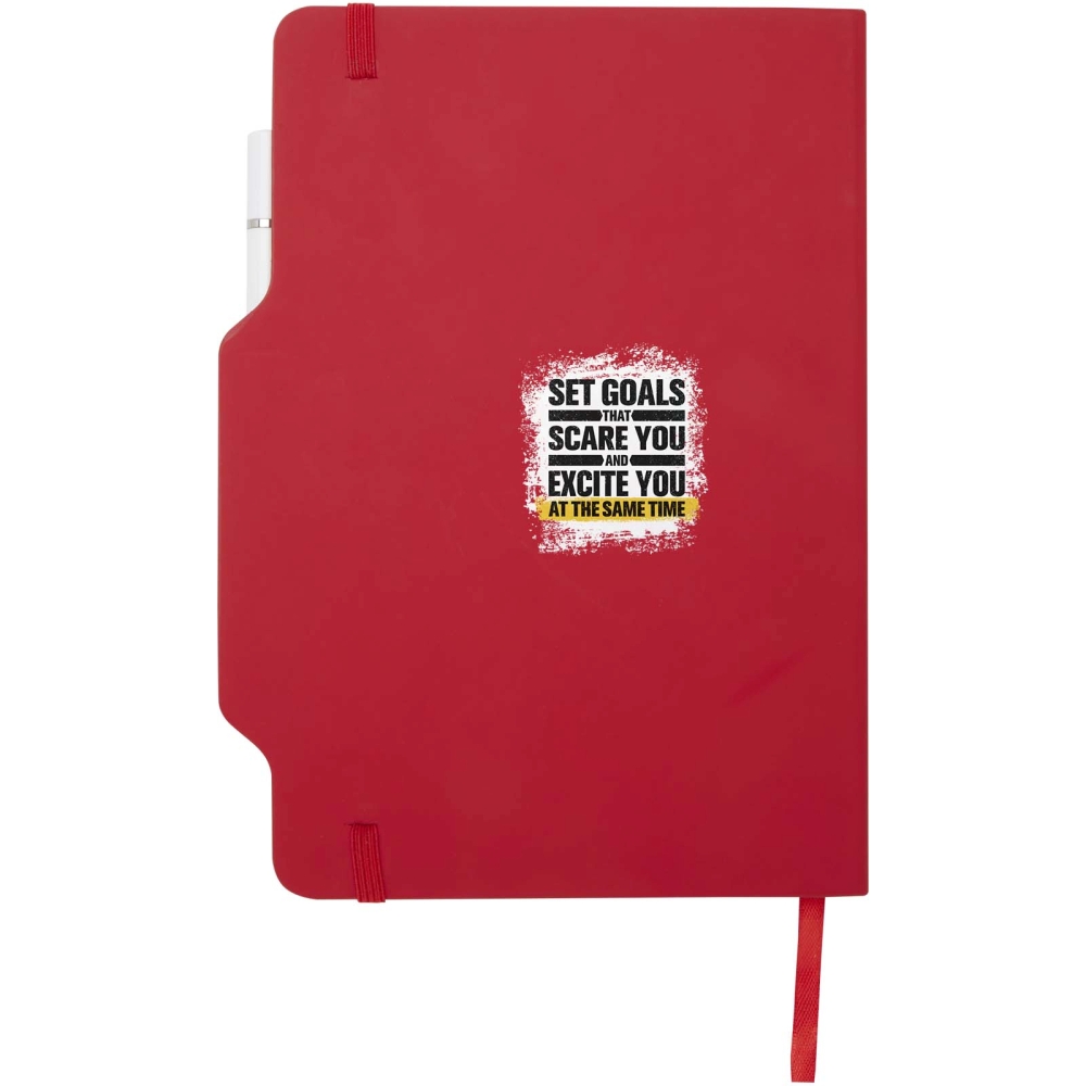 Zápisník A5 s pevnou obálkou s kombinací pera/tužky obsahuje 80 linkovaných listů papíru v krémové barvě o gramáži 70 g/m2, zaoblené rohy, elastické zavírání a záložku. Pero je dvouhlavé, kde na jedné straně je pero s černým inkoustem a na druhé straně tužka. Šířka psací stopy pera: 1000 metrů. Rozměr hrotu: 1,00 mm. Rozměry: 21 x 14,5 cm