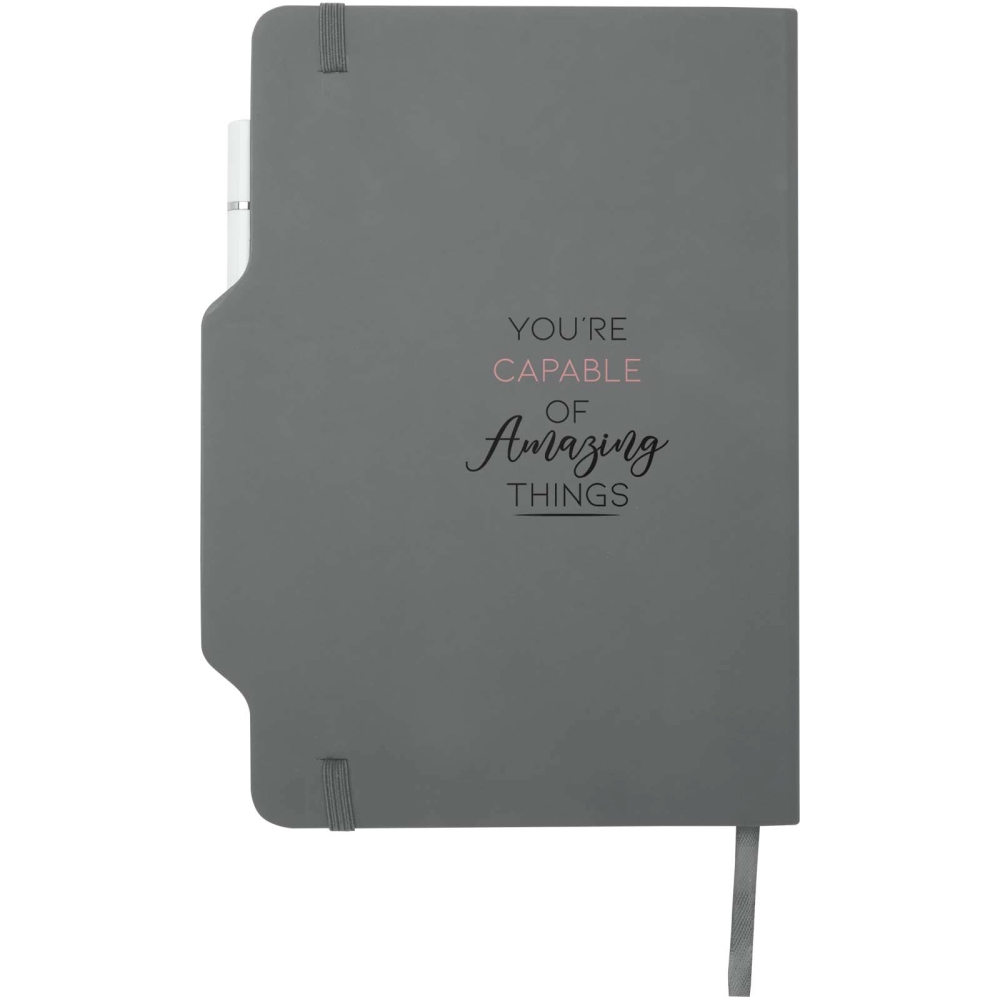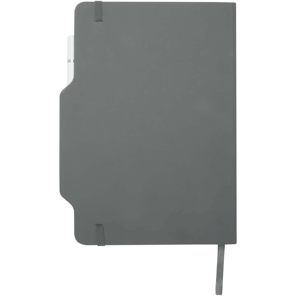 Zápisník A5 s pevnou obálkou s kombinací pera/tužky obsahuje 80 linkovaných listů papíru v krémové barvě o gramáži 70 g/m2, zaoblené rohy, elastické zavírání a záložku. Pero je dvouhlavé, kde na jedné straně je pero s černým inkoustem a na druhé straně tužka. Šířka psací stopy pera: 1000 metrů. Rozměr hrotu: 1,00 mm. Rozměry: 21 x 14,5 cm