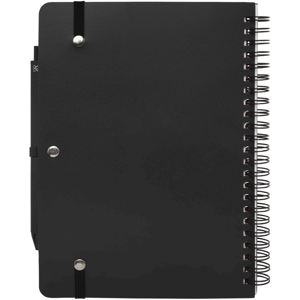 Zápisník formátu A5 s pevnou obálkou je vyroben z recyklovaného plastu, který by jinak skončil v oceánu, s 80 linkovanými listy papíru v krémové barvě o gramáži 70 g/m2. Zápisník má zaoblené rohy, elastické zavírání a poutko na pero. Propiska s černým inkoustem je také vyrobena z recyklovaného plastu z oceánu. Délka psaní: 1000 metrů. Rozměr hrotu: 1,0 mm. Rozměry: 21 x 14,5 cm