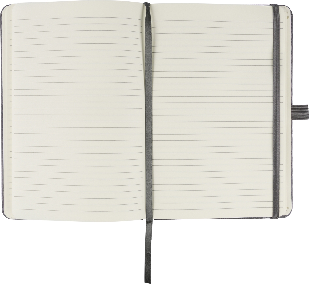 Polyesterový zápisník rPET 600D s PU povrchovou úpravou, formát papíru A5. Obsahuje 80 listů linkovaného papíru o gramáži 70 g/m2 a je vybaven záložkou se stuhou, gumičkou a poutkem na pero. Polotvrdá vazba. Na zadní straně je vyražené recyklované logo. Rozměry: 21 cm x 14,8 cm