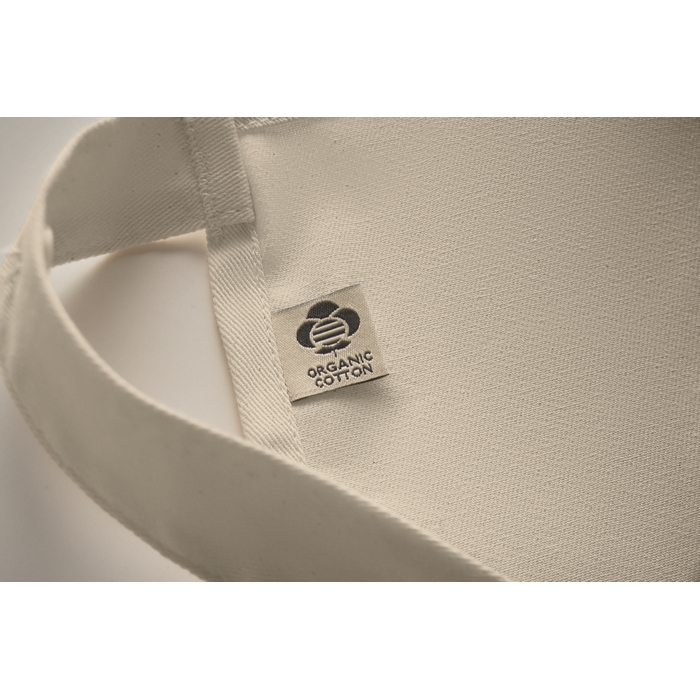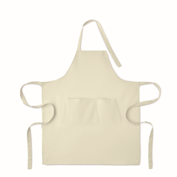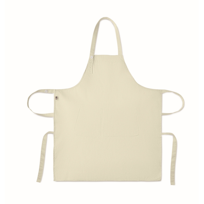 Nastavitelná zástěra s laclem a 1 velkou přední kapsou a 2 přihrádkami. Organická bavlna o gramáži 240 g/m2. S nastavitelným popruhem pomocí knoflíku. Rozměry: 75 x 90 cm