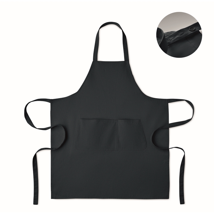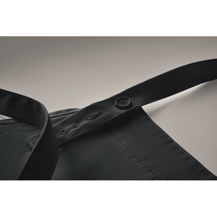 Nastavitelná zástěra s laclem a 1 velkou přední kapsou a 2 přihrádkami. Organická bavlna o gramáži 240 g/m2. S nastavitelným popruhem pomocí knoflíku. Tento výrobek má certifikát OEKO-TEX® STANDARD 100.Rozměry: 75 x 90cm