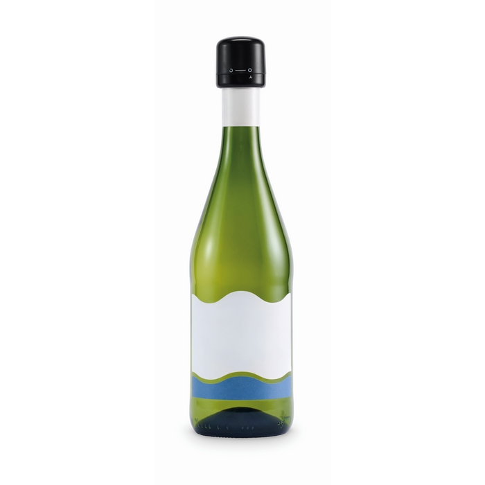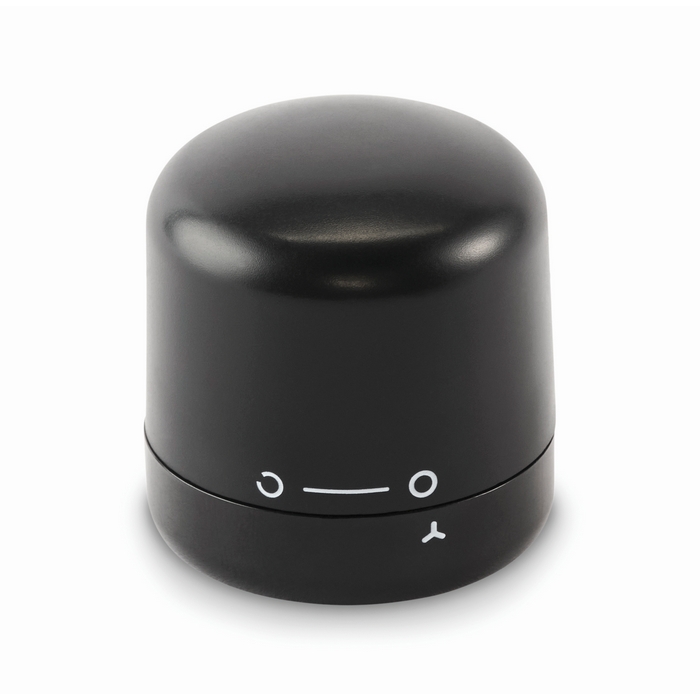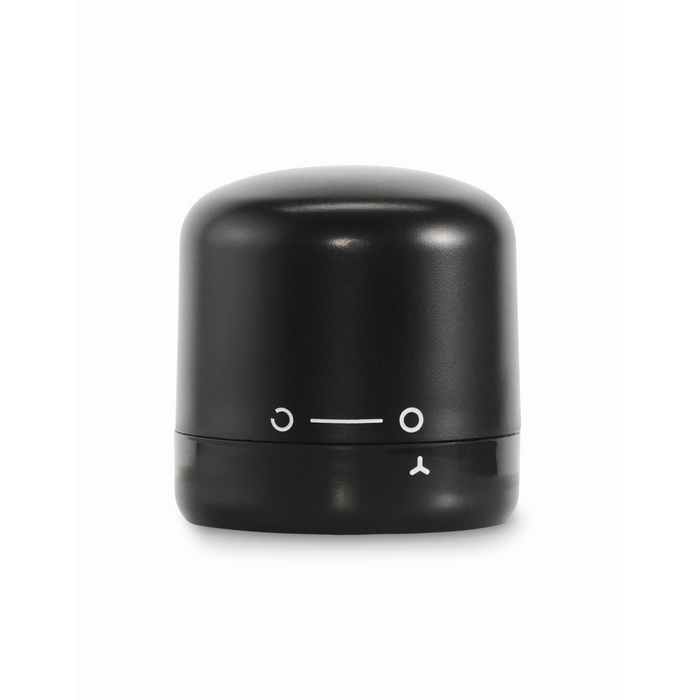 Zátka z recyklovaného ABS na lahve sektu. Otočný uzamykací mechanismus s těsněním. Rozměry: O3.9 x 4 cm